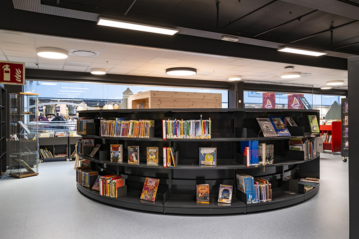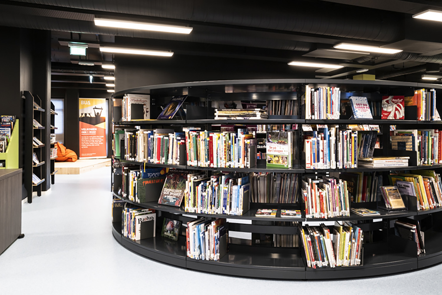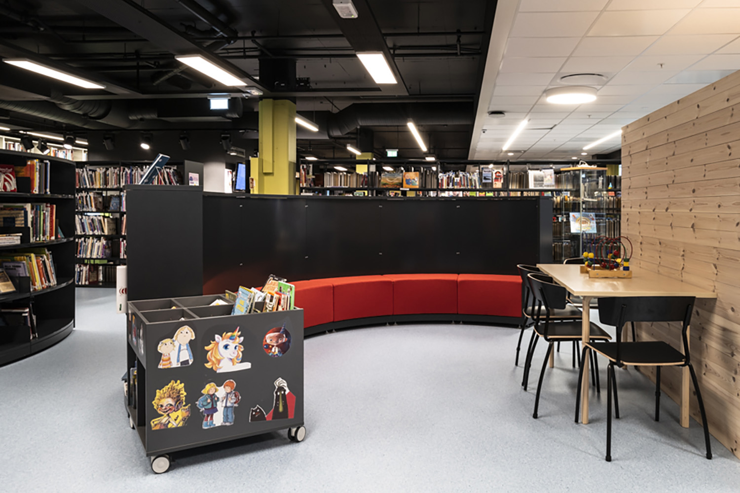 Dans l’espace jeunesse, des meubles de rangement et de présentations sont colorés. Les rayonnages sont majoritairement bas et courbes avec des espaces de lecture intégrés, permettant ainsi aux enfants de se plonger pleinement dans le monde du livre.
