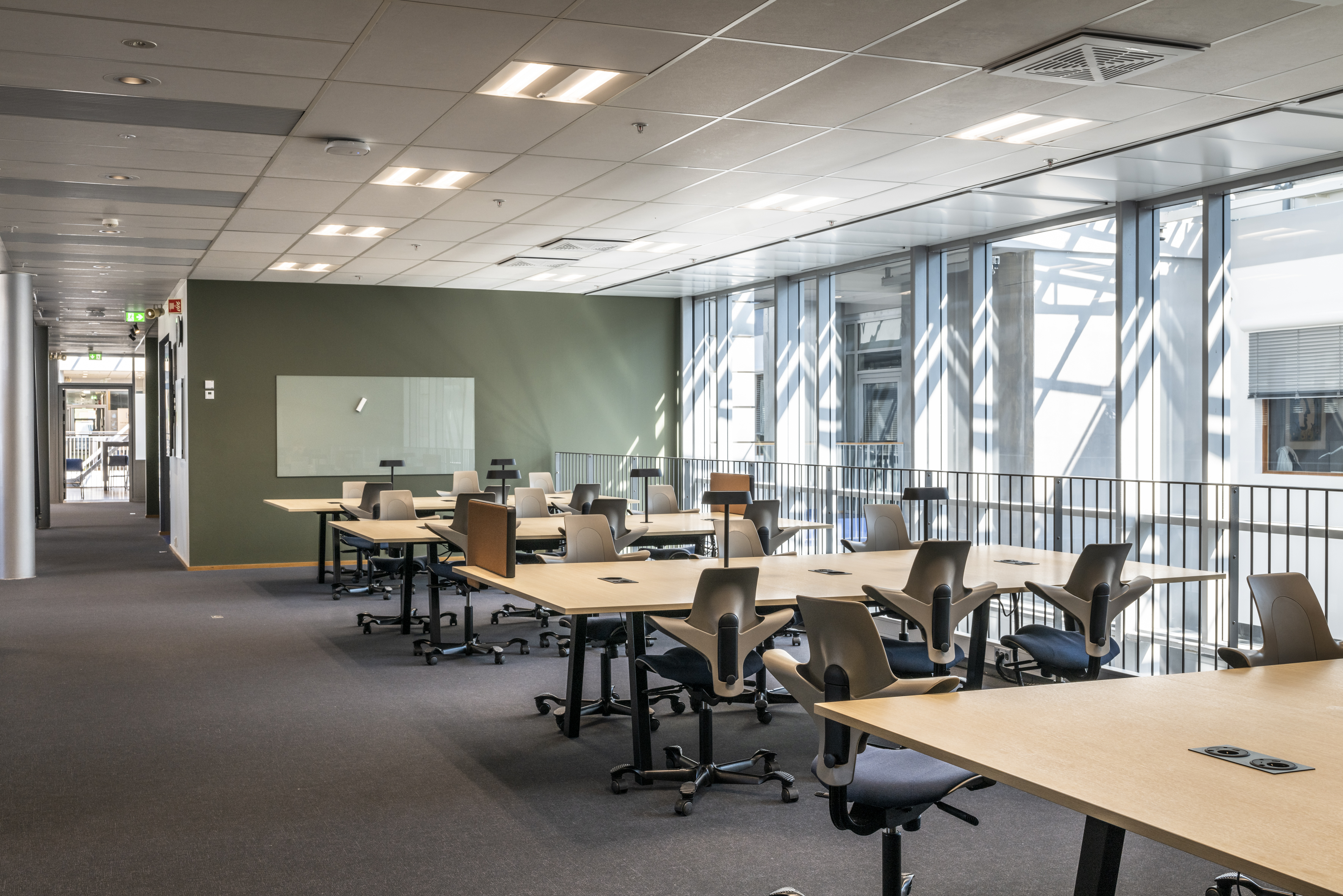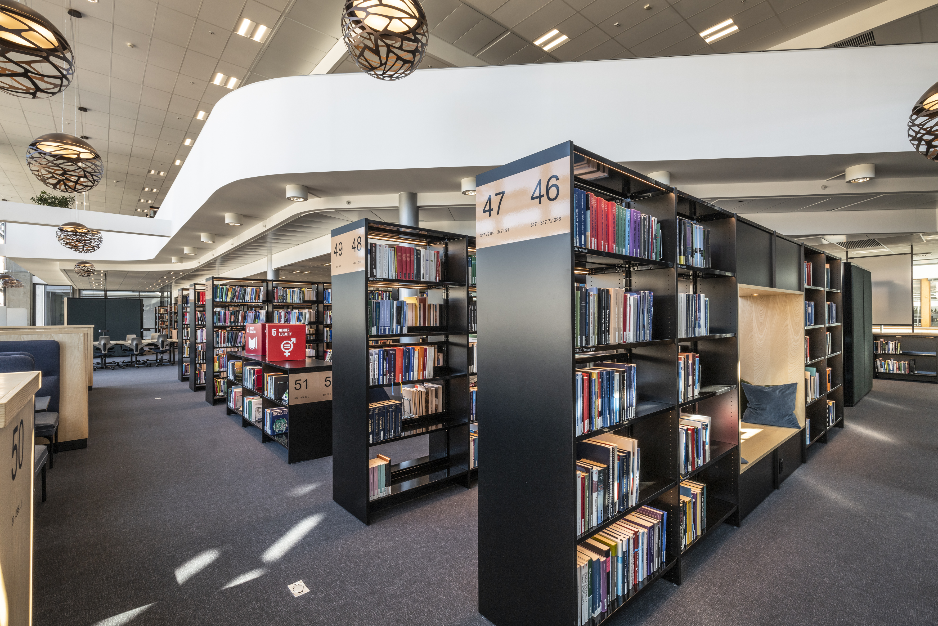 Le résultat est une magnifique bibliothèque répartie sur deux niveaux, aux 5 -ème et 6 -ème étages du bâtiment, parée de couleurs chaudes et d'inspiration scandinave. L'agencement de l'espace, avec ses plafonds hauts et sa lumière naturelle abondante, constitue la base parfaite pour atteindre les objectifs de la bibliothèque et offrir une grande variété de prestations.