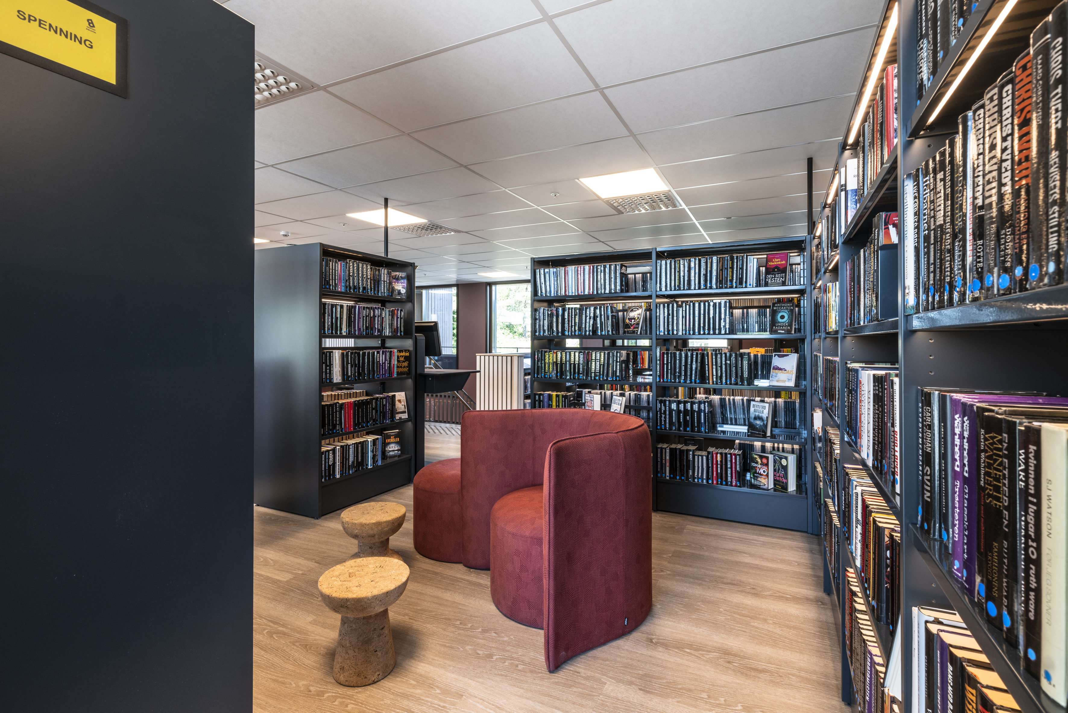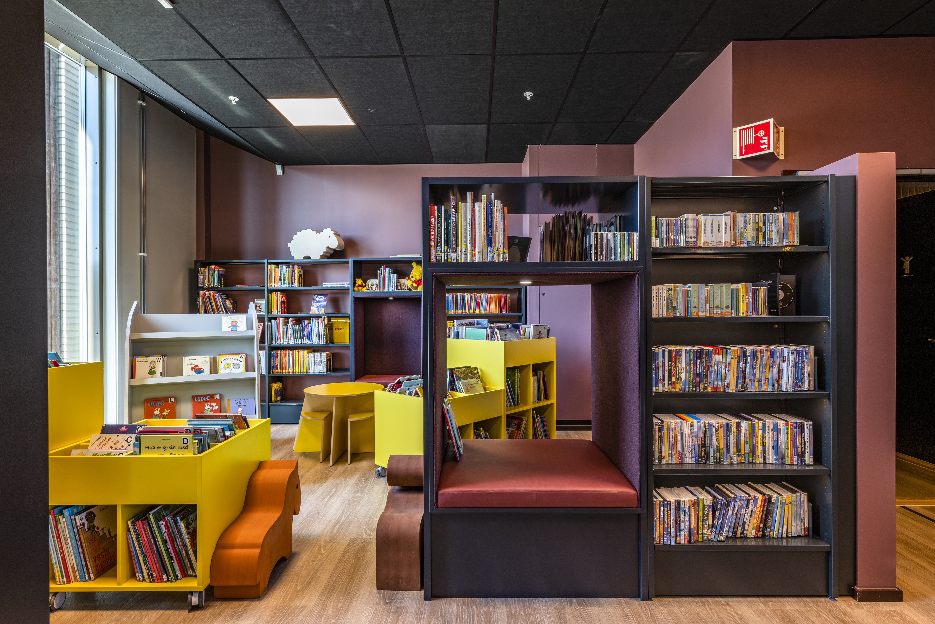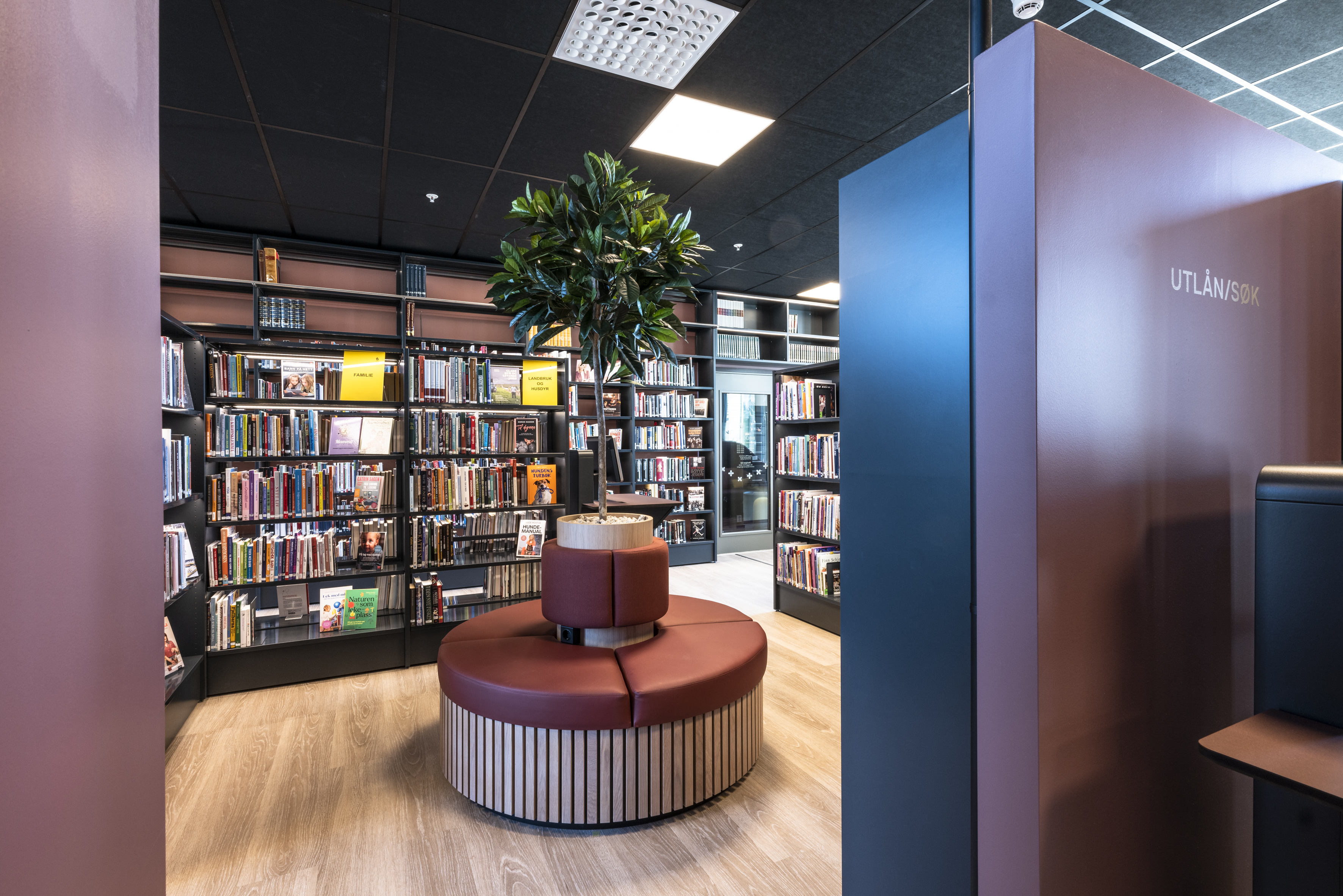 Après avoir passé plus de 40 ans dans le sous-sol d'une école, la bibliothèque de Skiptvet bénéficie désormais d'un emplacement idéal dans le nouveau quartier moderne de Torggården. Les différents départements sont répartis sur deux niveaux, reliés par un escalier orné d'amusants luminaires en forme de cage à oiseaux suspendus entre les deux étages. Différents éléments tels que l'air, la lumière et les couleurs chaudes ont été privilégiés pour rendre le nouveau lieu de rencontre de la collectivité aussi accueillant que possible. Parallèlement, une atmosphère de bien-être règne grâce à l'utilisation de composants naturels - par exemple, de nombreuses plantes de différentes formes et tailles sont présentes un peu partout dans la bibliothèque.