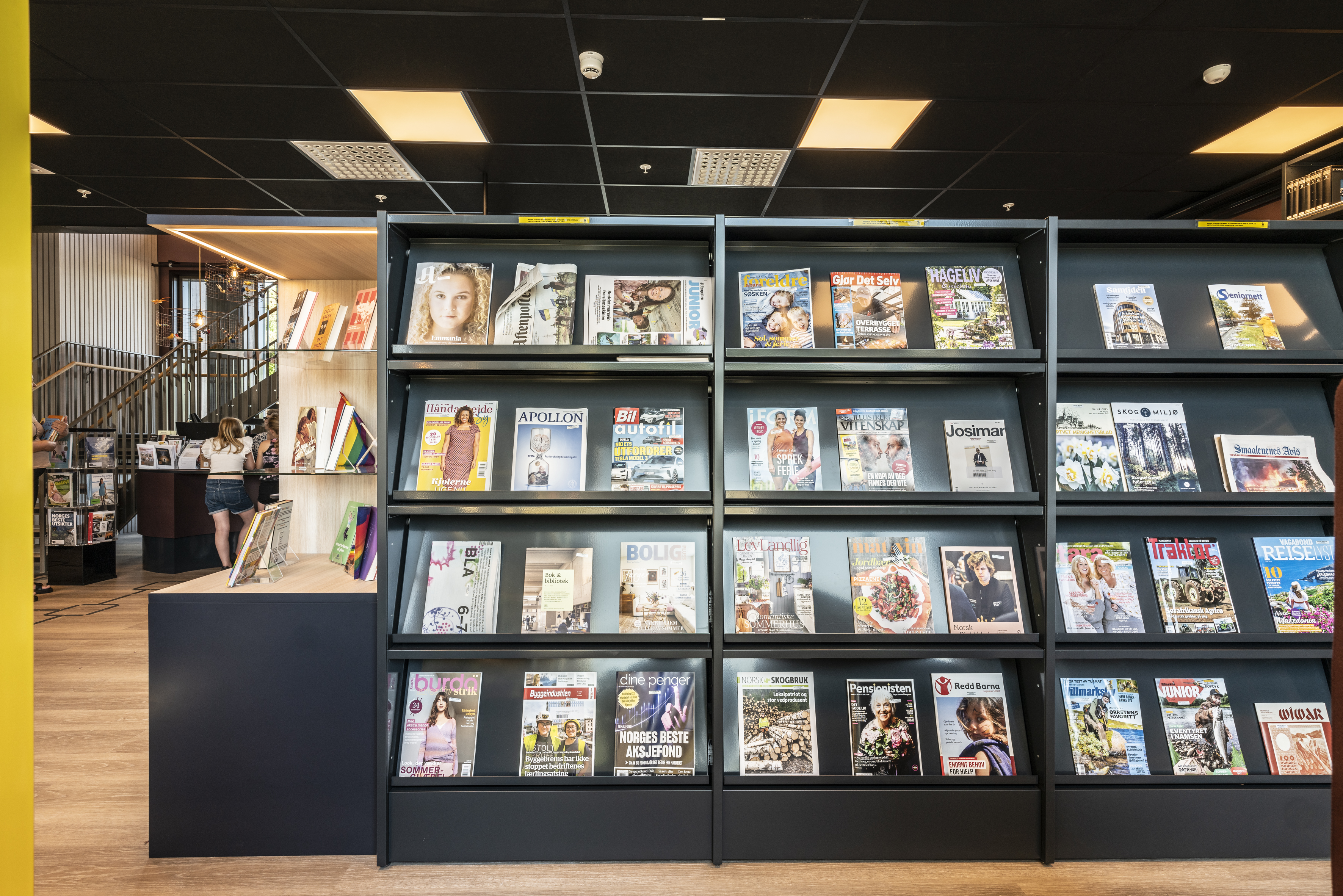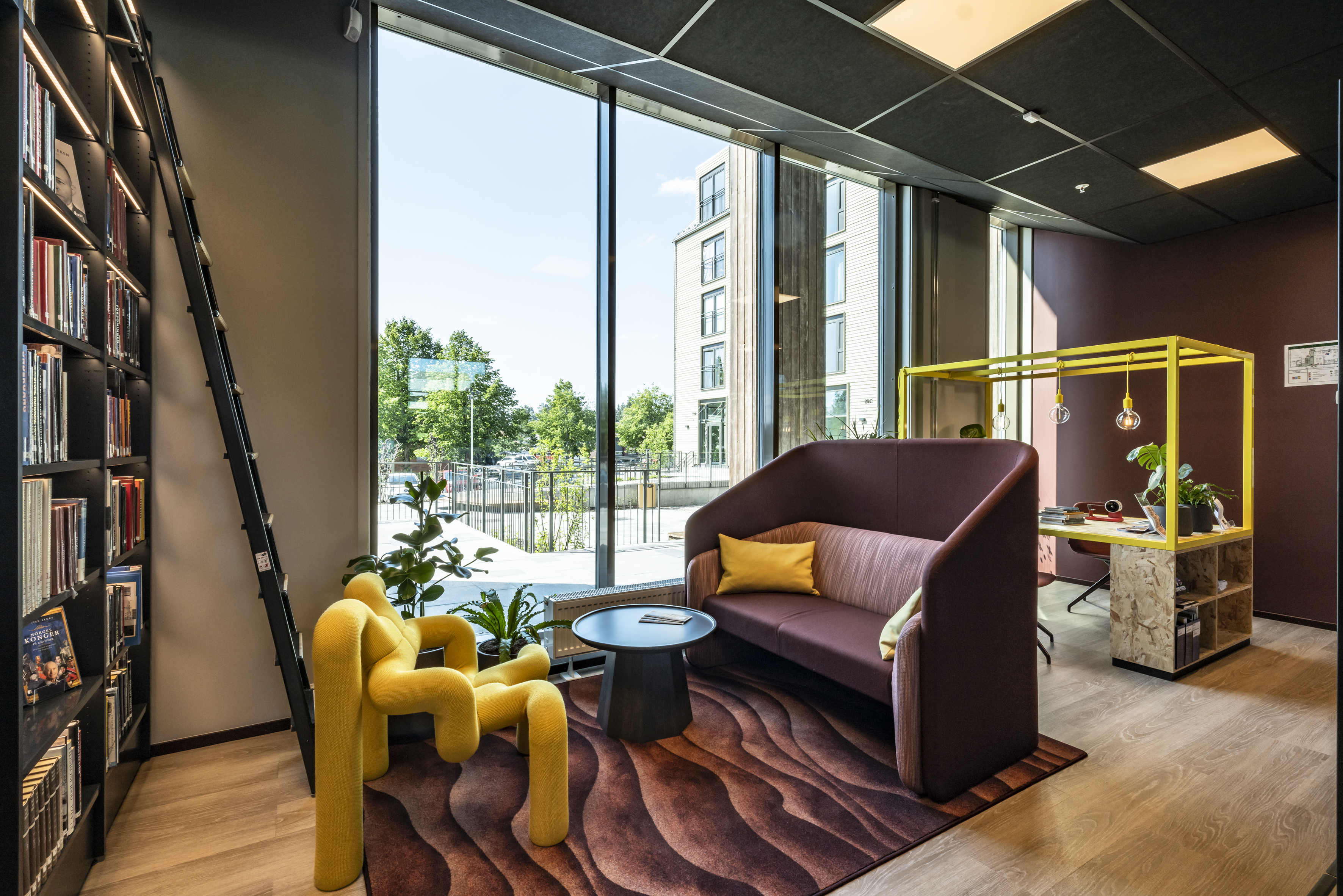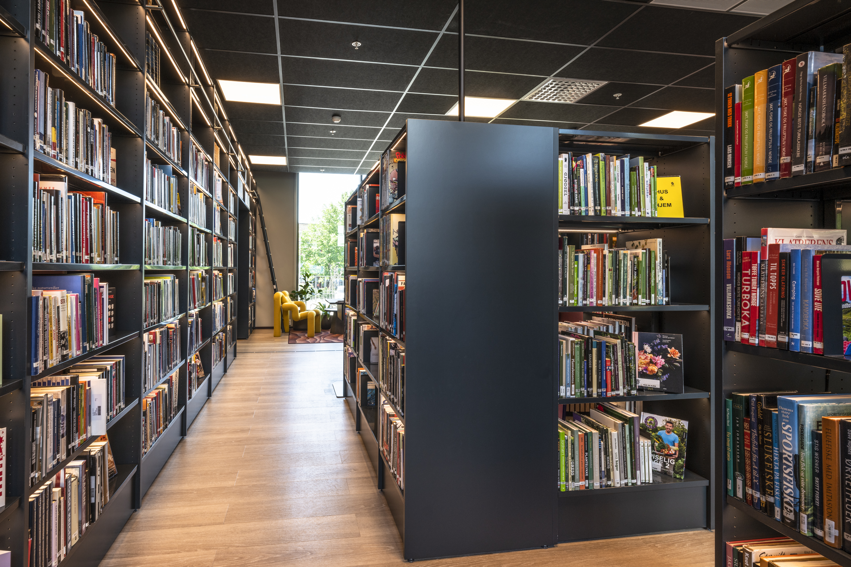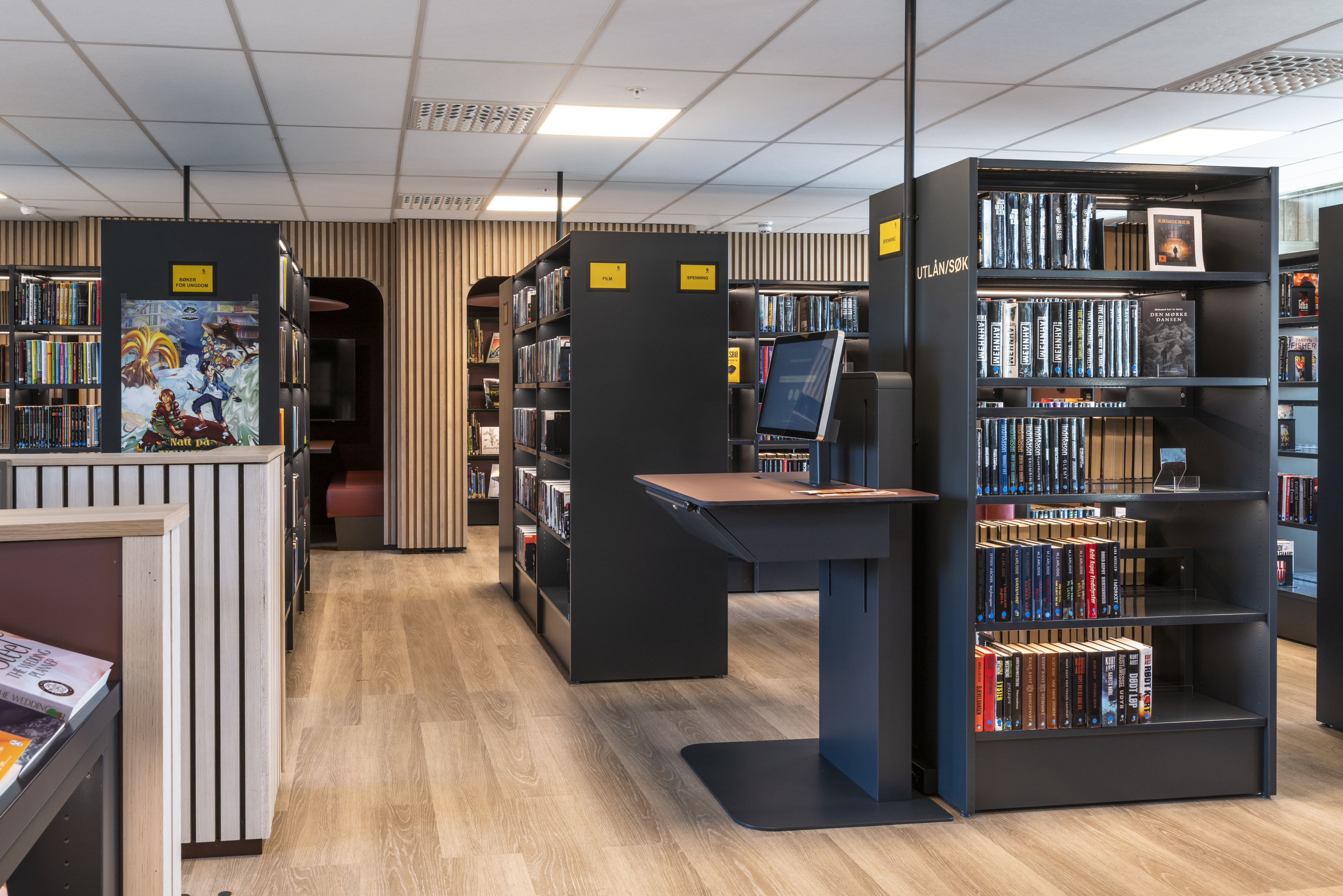 Après avoir passé plus de 40 ans dans le sous-sol d'une école, la bibliothèque de Skiptvet bénéficie désormais d'un emplacement idéal dans le nouveau quartier moderne de Torggården. Les différents départements sont répartis sur deux niveaux, reliés par un escalier orné d'amusants luminaires en forme de cage à oiseaux suspendus entre les deux étages. Différents éléments tels que l'air, la lumière et les couleurs chaudes ont été privilégiés pour rendre le nouveau lieu de rencontre de la collectivité aussi accueillant que possible. Parallèlement, une atmosphère de bien-être règne grâce à l'utilisation de composants naturels - par exemple, de nombreuses plantes de différentes formes et tailles sont présentes un peu partout dans la bibliothèque.