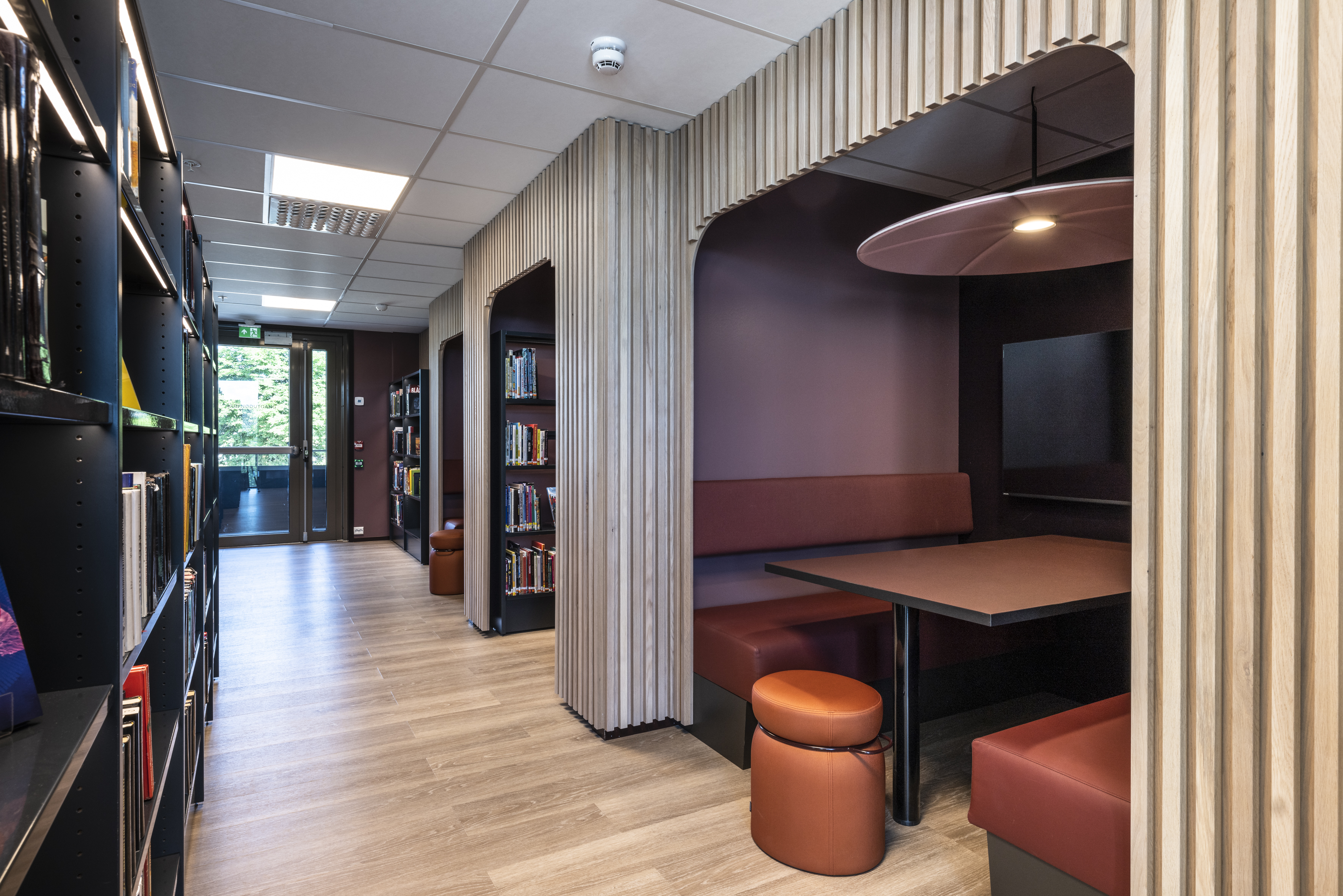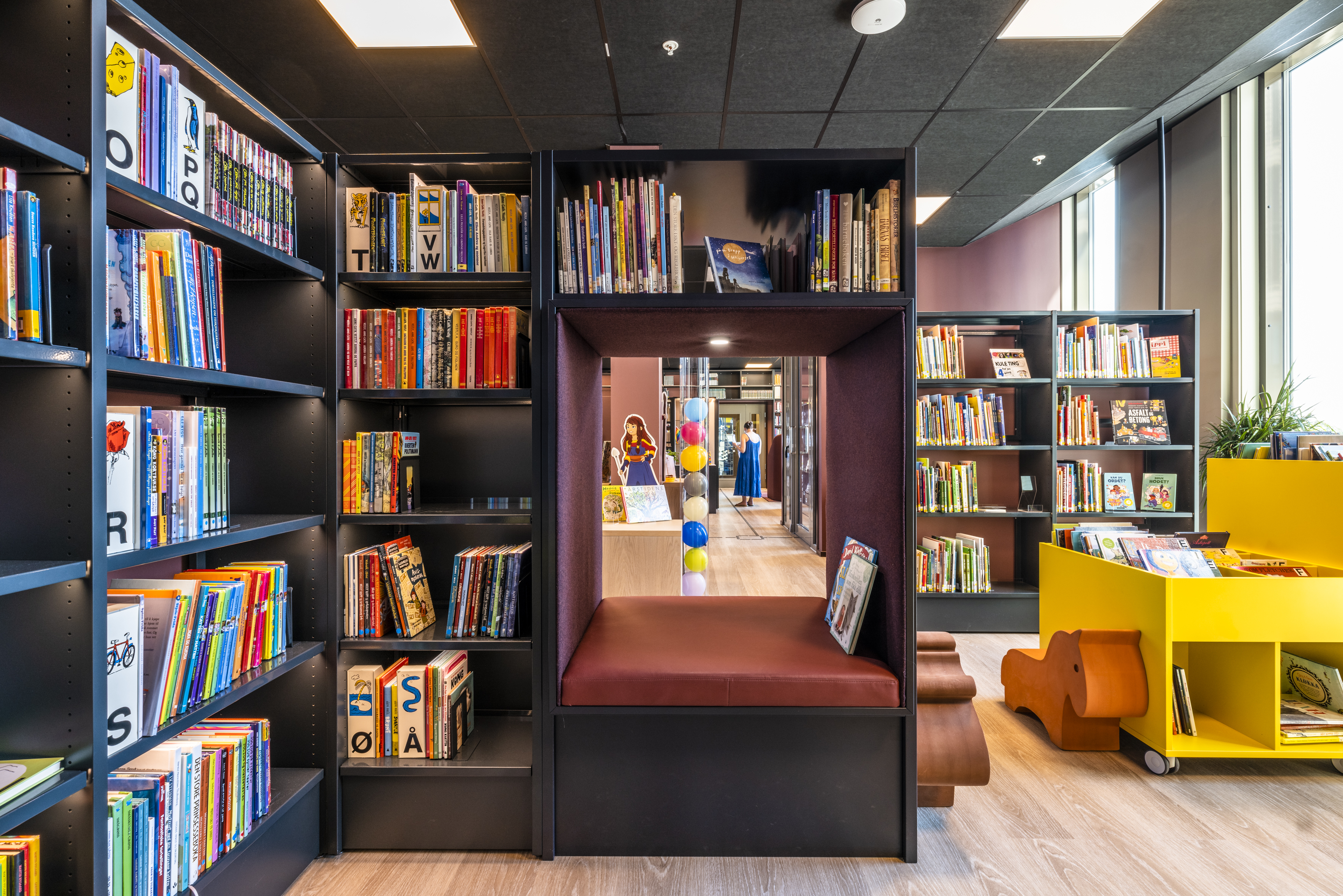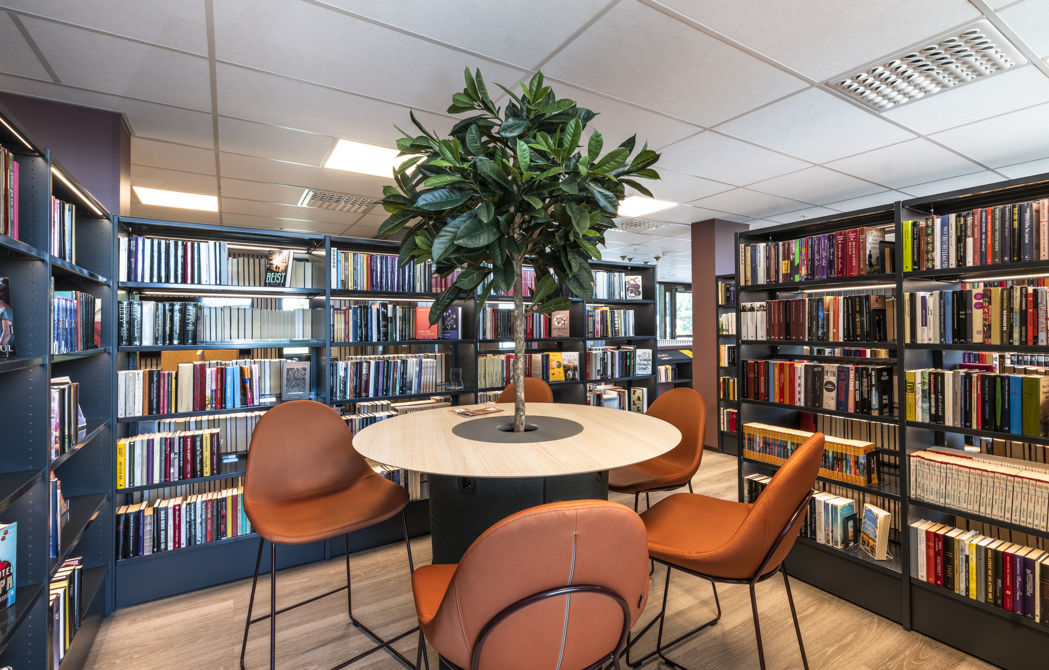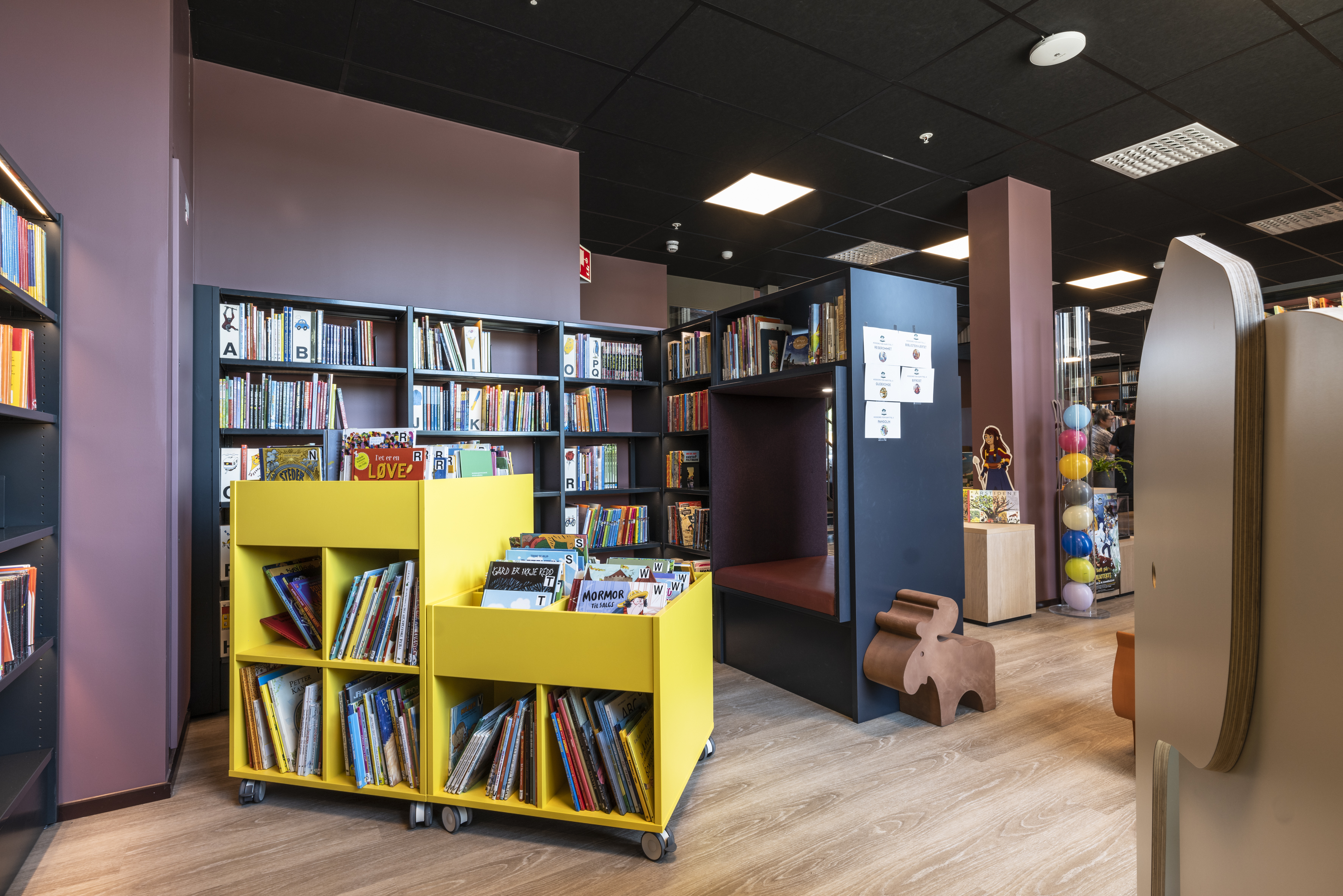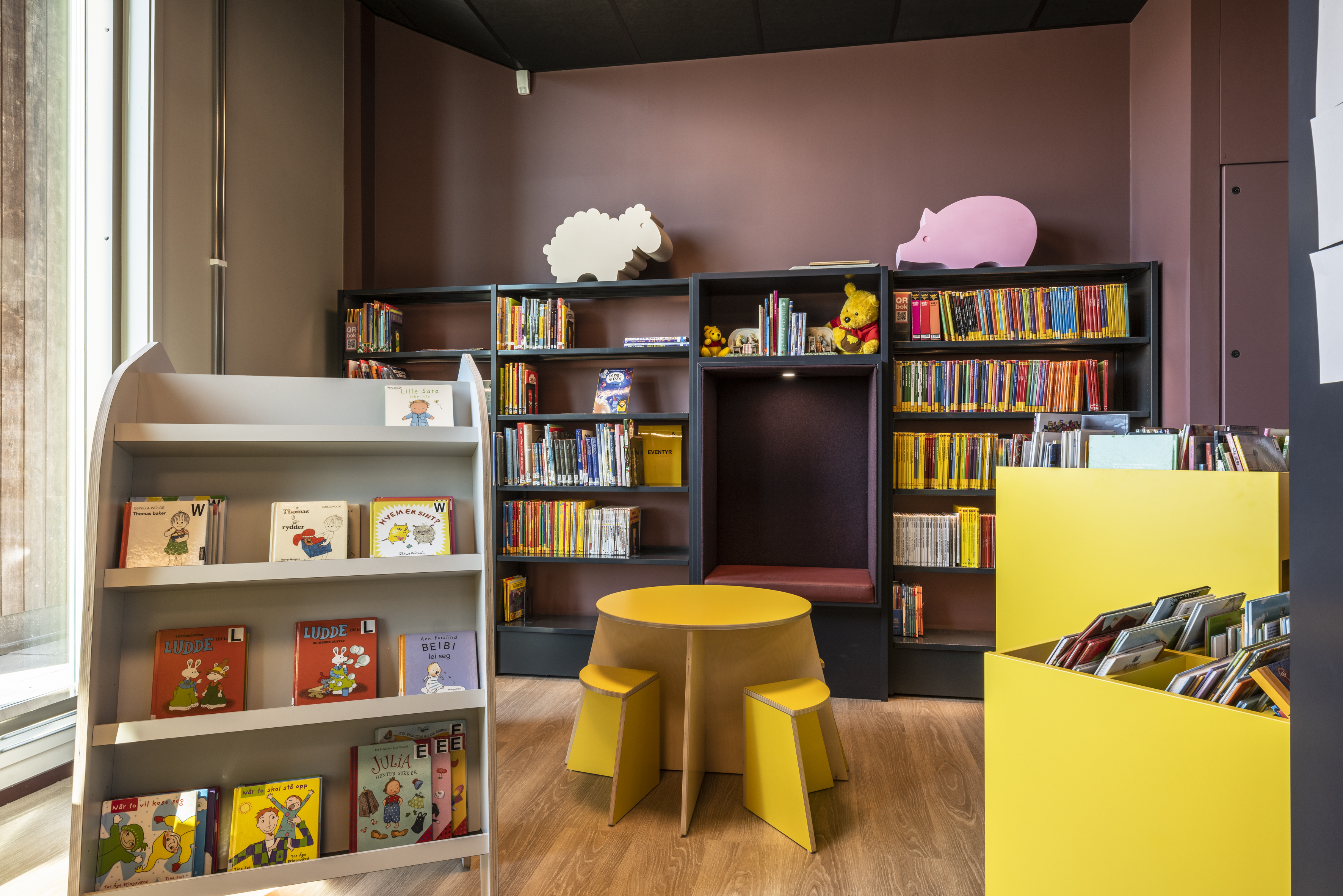 Au premier étage, se trouvent la section enfants avec des meubles colorés et de nombreux bacs à albums ainsi que la section adultes, avec les documentaires, usuels et un espace magazines et presse. Au deuxième étage, se trouve la fiction pour adultes, avec sa propre "salle" pour les polars. La section jeunesse a été placée un peu à l'écart, dans la partie la plus reculée de ce niveau, où les jeunes peuvent se retirer dans des cabines confortables et cosy pour étudier et travailler seul ou en groupe. On peut également y trouver le fonds patrimonial, bien conservé dans de hautes étagères aux portes vitrées fermant à clé.