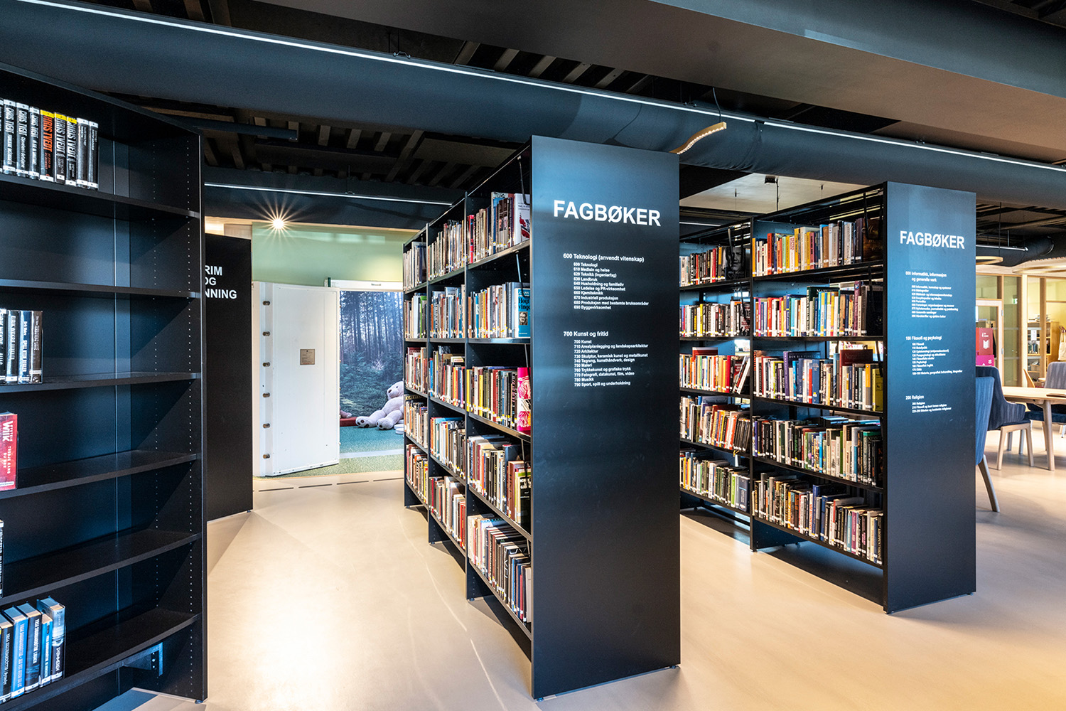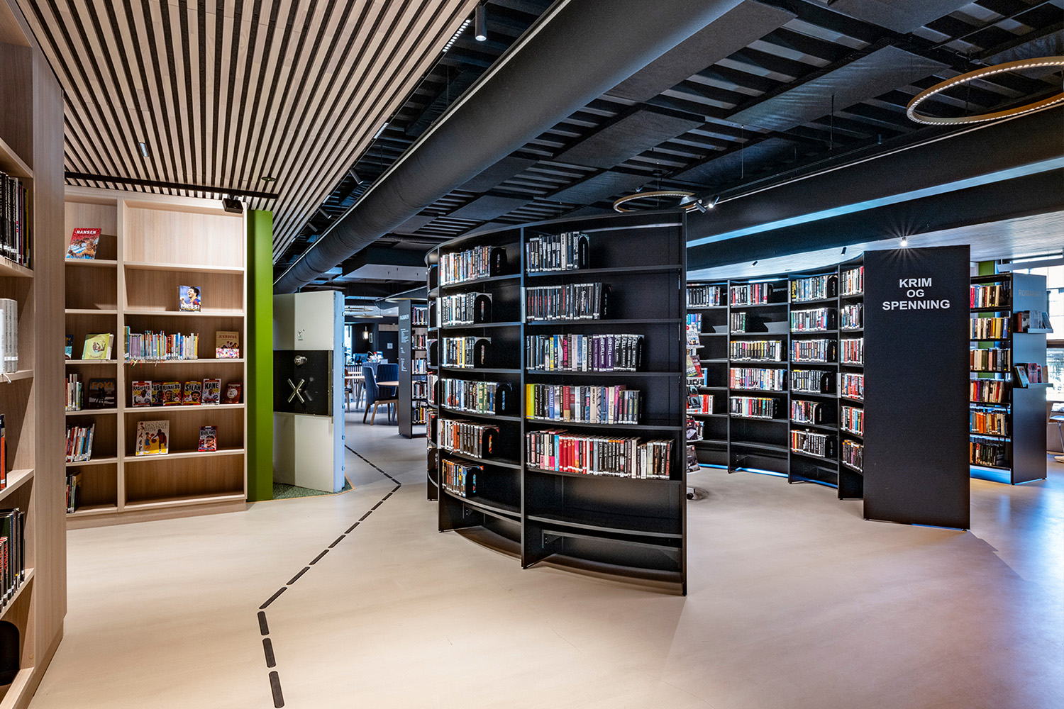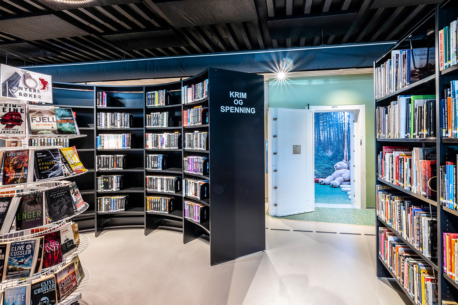 L'équipe d'architectes intérieurs norvégiens de BS Eurobib a conservé l'ancienne chambre forte de la banque afin de sauvegarder une partie de l'histoire du bâtiment. Elle abrite désormais une salle de lecture très accueillante pour les enfants en conservant le thème de la forêt qui se décline dans le reste de la section jeunesse.