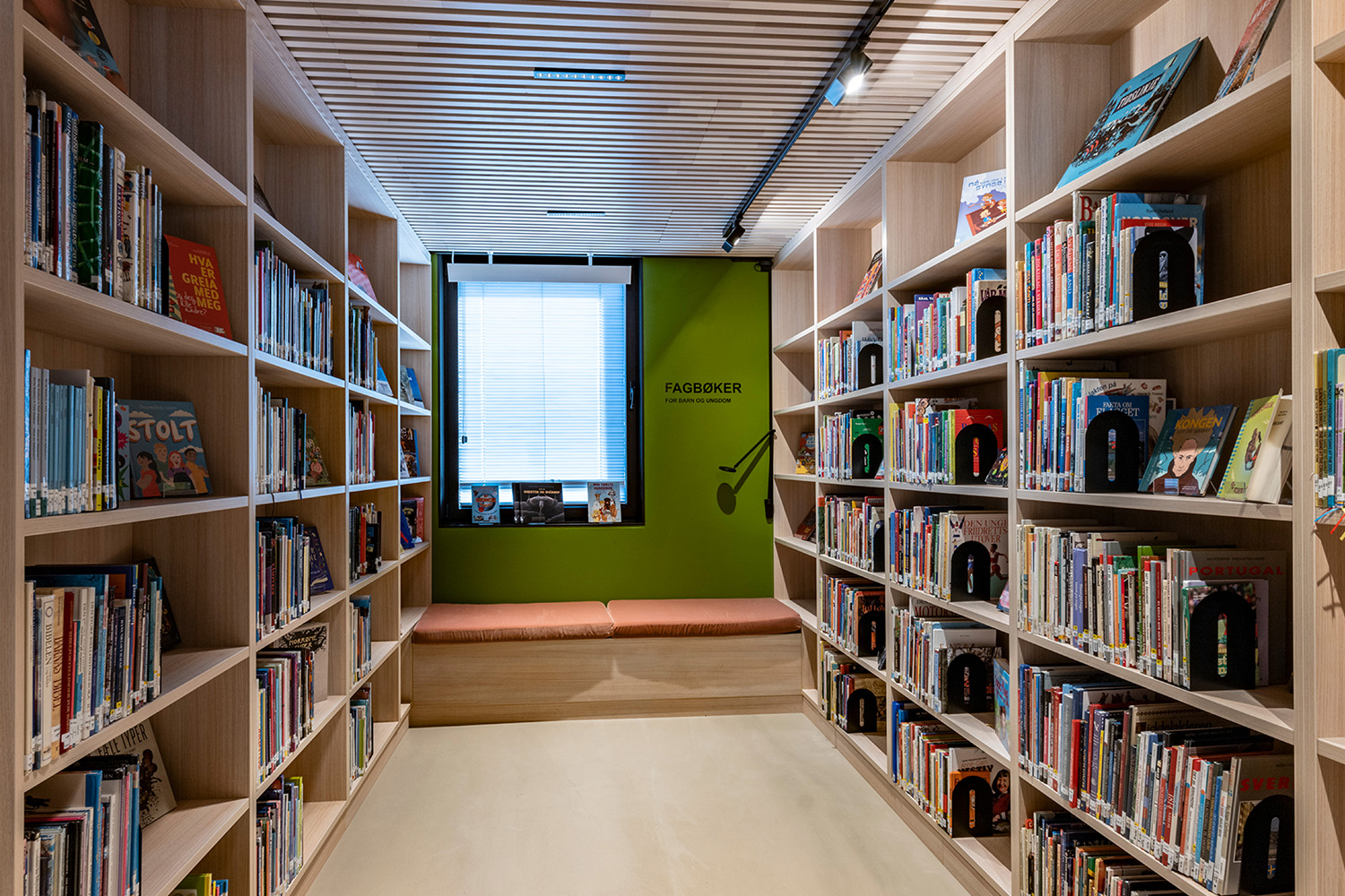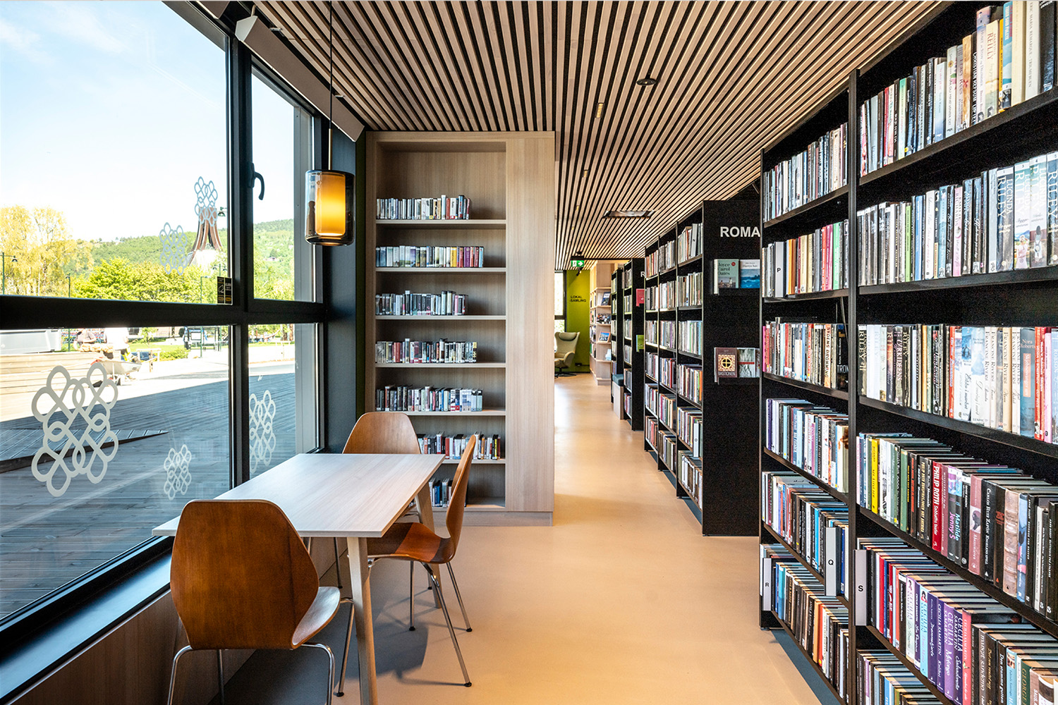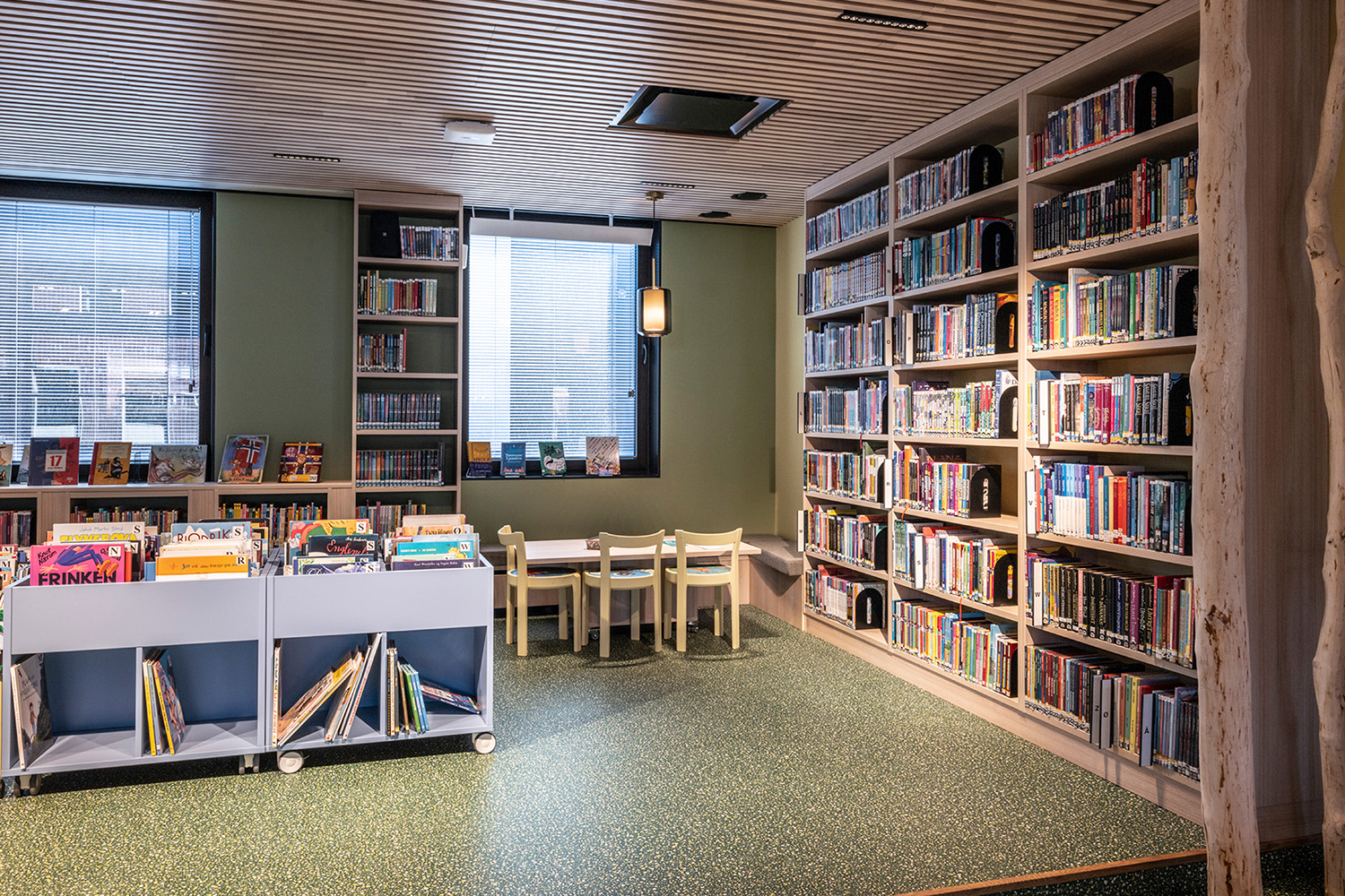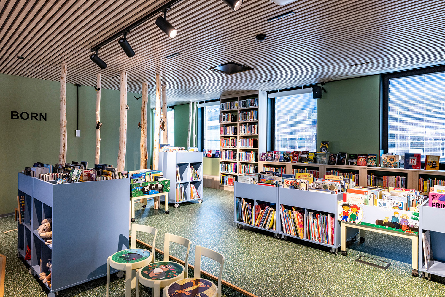 L'équipe d'architectes intérieurs norvégiens de BS Eurobib a conservé l'ancienne chambre forte de la banque afin de sauvegarder une partie de l'histoire du bâtiment. Elle abrite désormais une salle de lecture très accueillante pour les enfants en conservant le thème de la forêt qui se décline dans le reste de la section jeunesse.