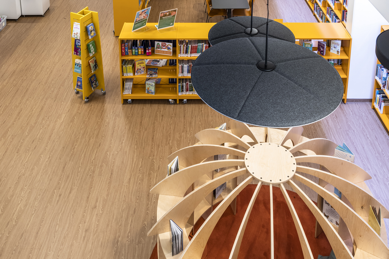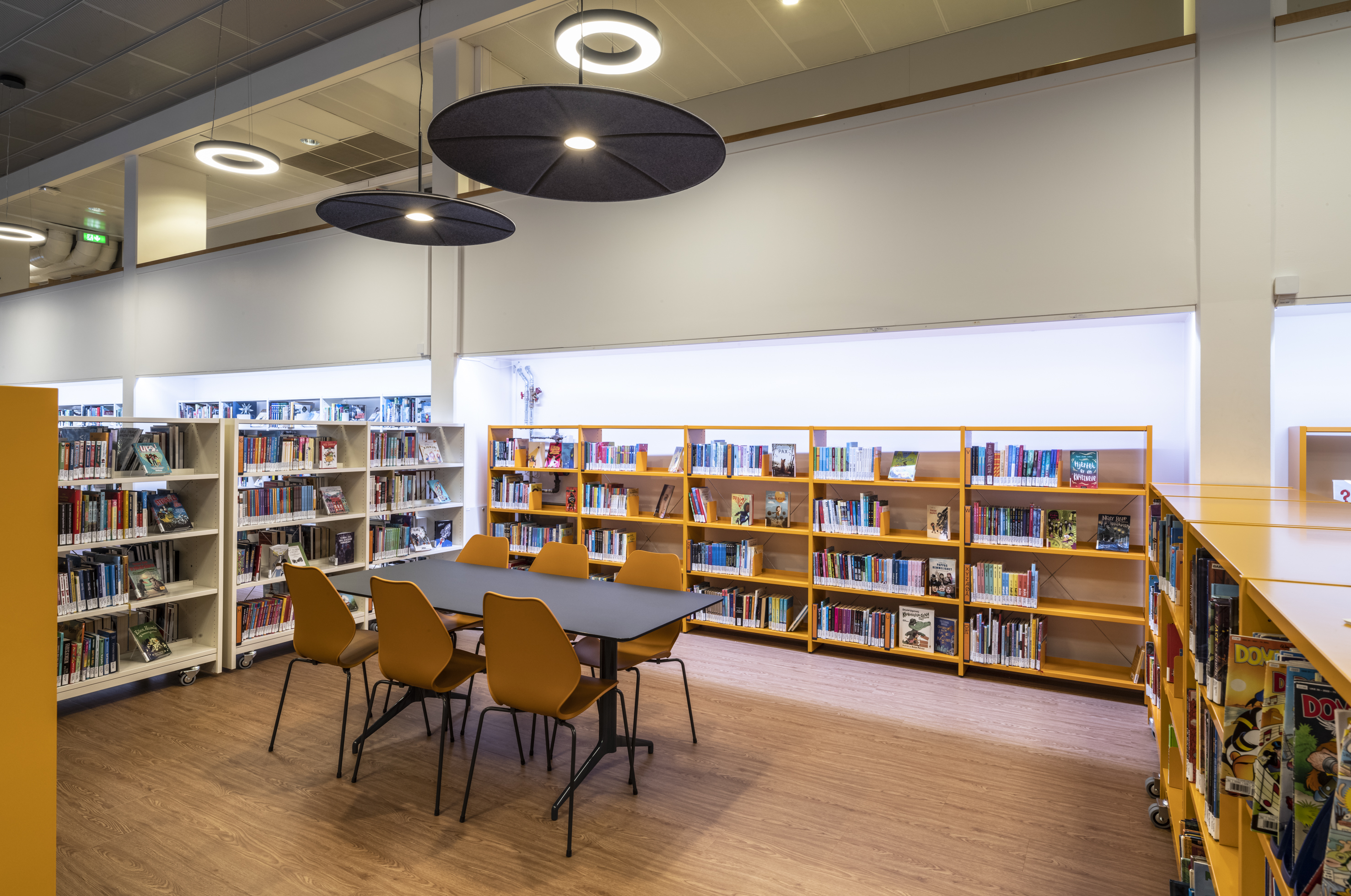 Mobilité, lumière et espace sont les maîtres mots de ce nouvel aménagement. Les rayonnages double-face sont tous munis de roulettes, ce qui facilite la polyvalence et la flexibilité de l'espace, notamment pour l'organisation d'événements. La hauteur des rayonnages est de 152 cm, ce qui crée une bibliothèque moins cloisonnée, offrant une meilleure vue d'ensemble et une plus grande luminosité.