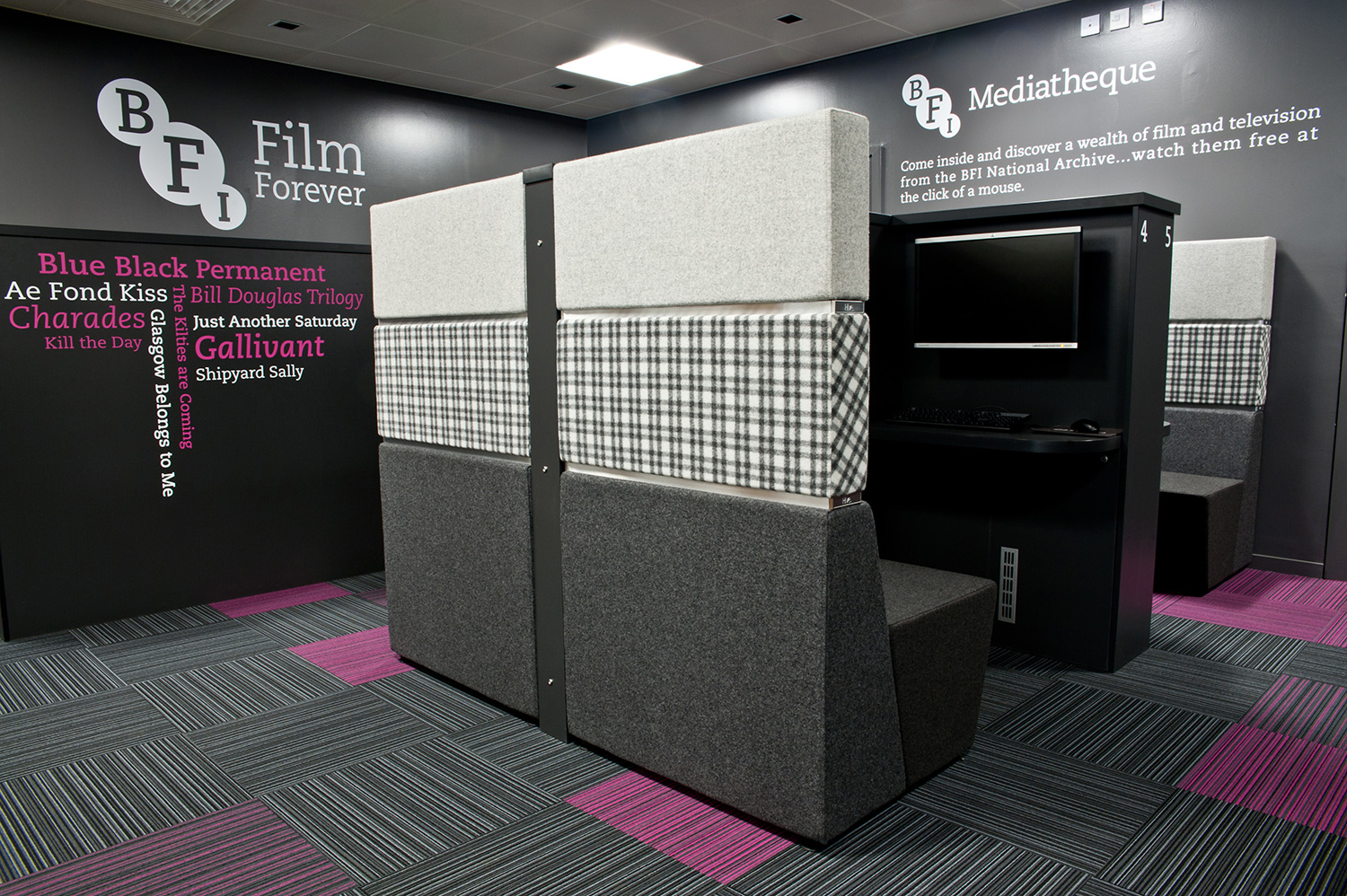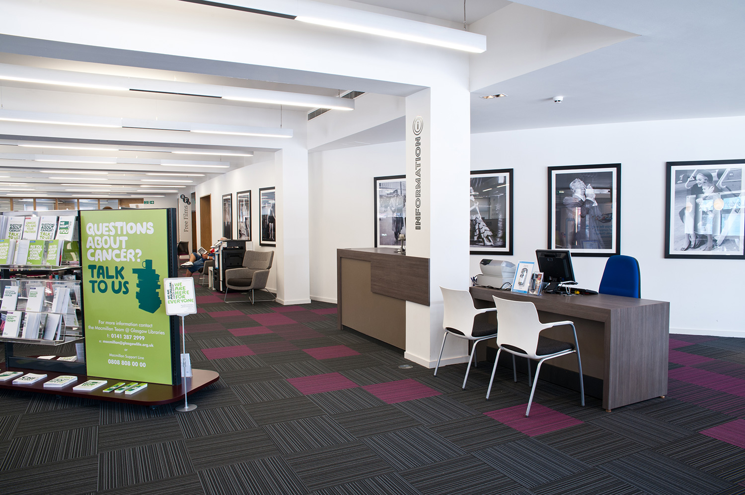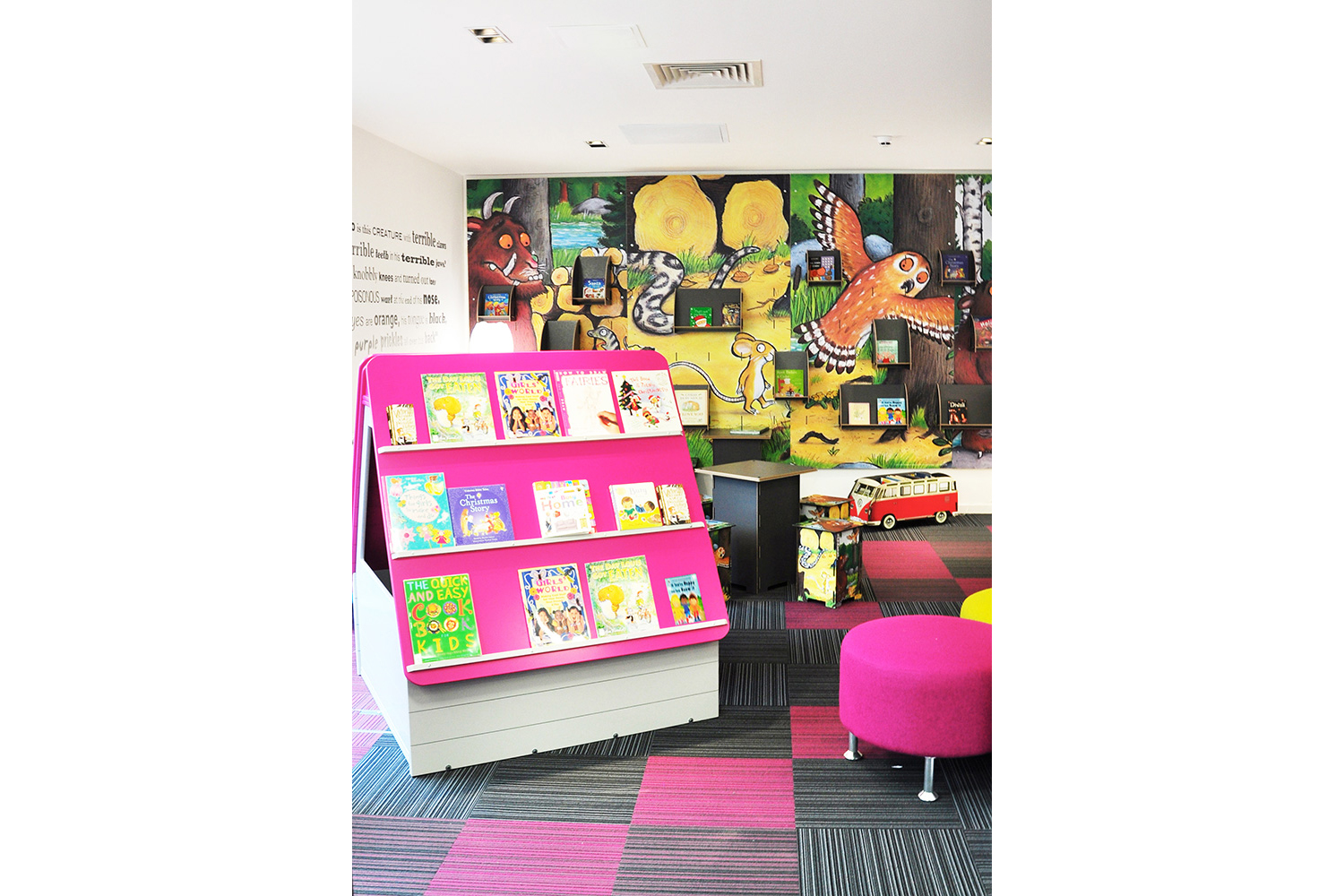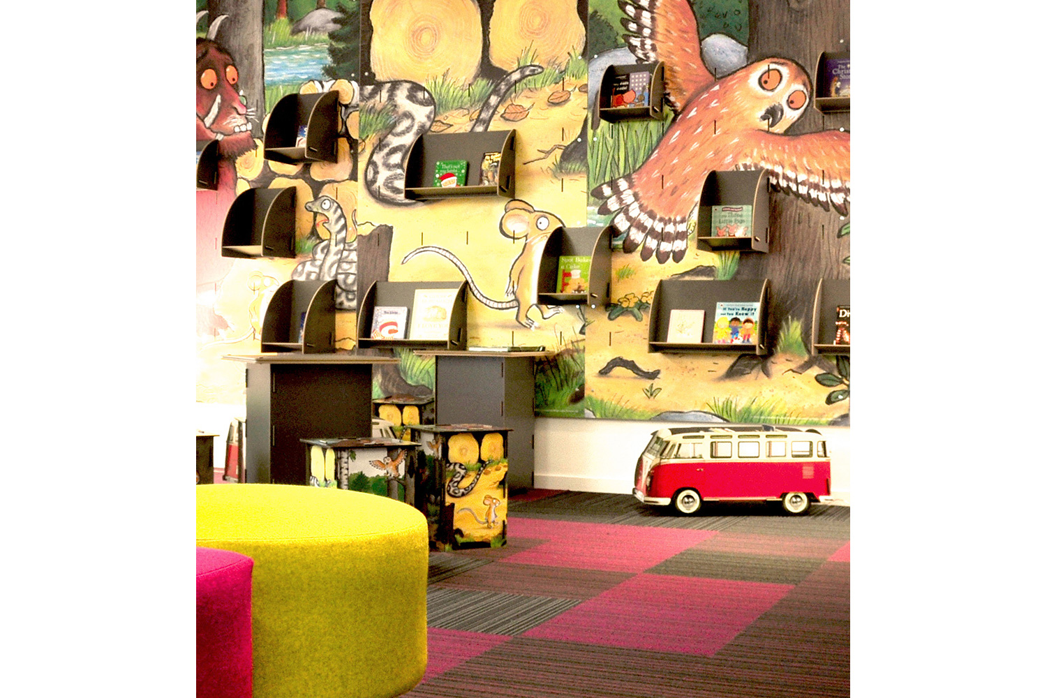 Les principaux thèmes et les sections de la bibliothèque sont renforcés par l’utilisation de graphiques et de signalétique, et avec la permission de Julia Donaldson, détentrice du prix Children’s Laureate (prix décerné tous les deux ans à un écrivain ou illustrateur pour célébrer la qualité de ses publications), nous avons utilisé les images de son livre à succès Gruffalo comme élément graphique mural dans la section enfants et poursuivi ce thème à travers le petit mobilier sur mesure.