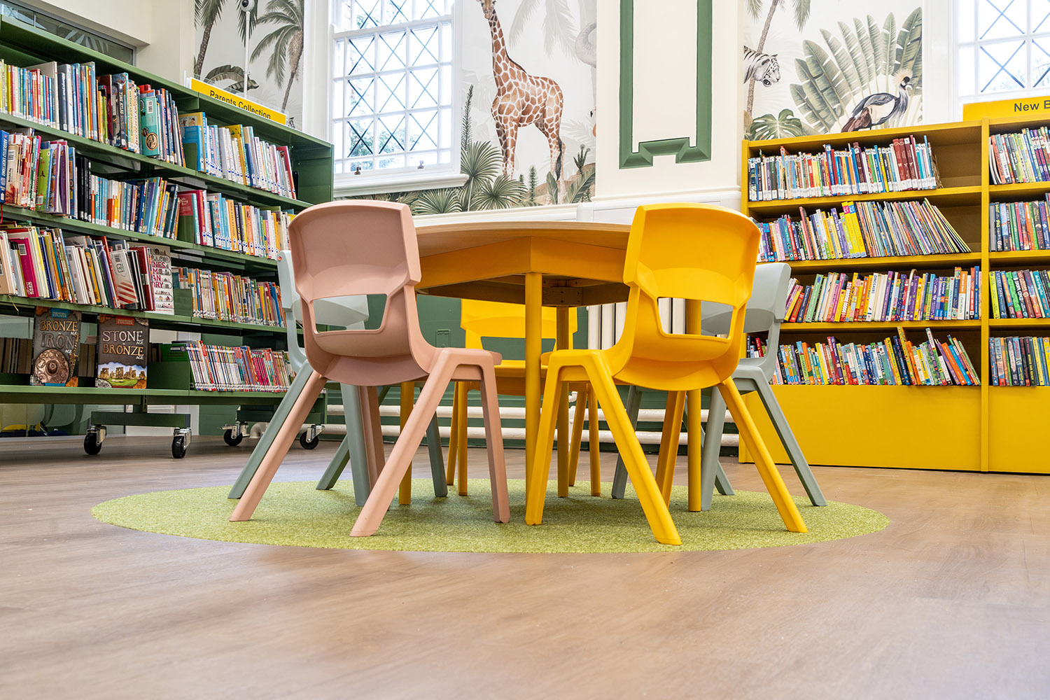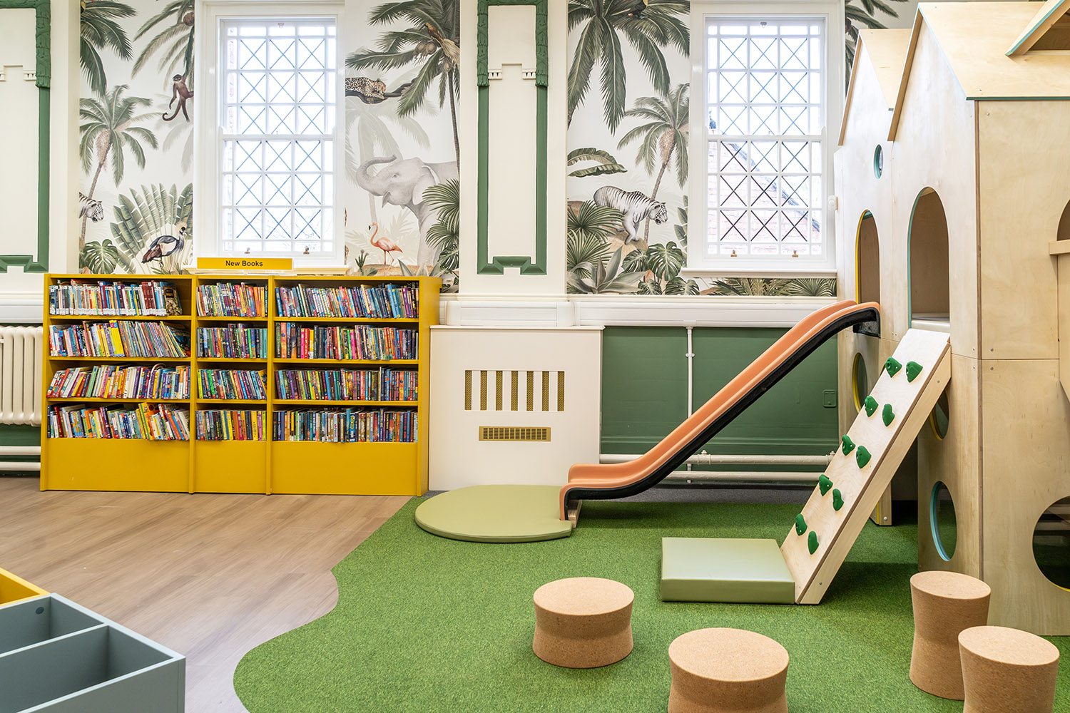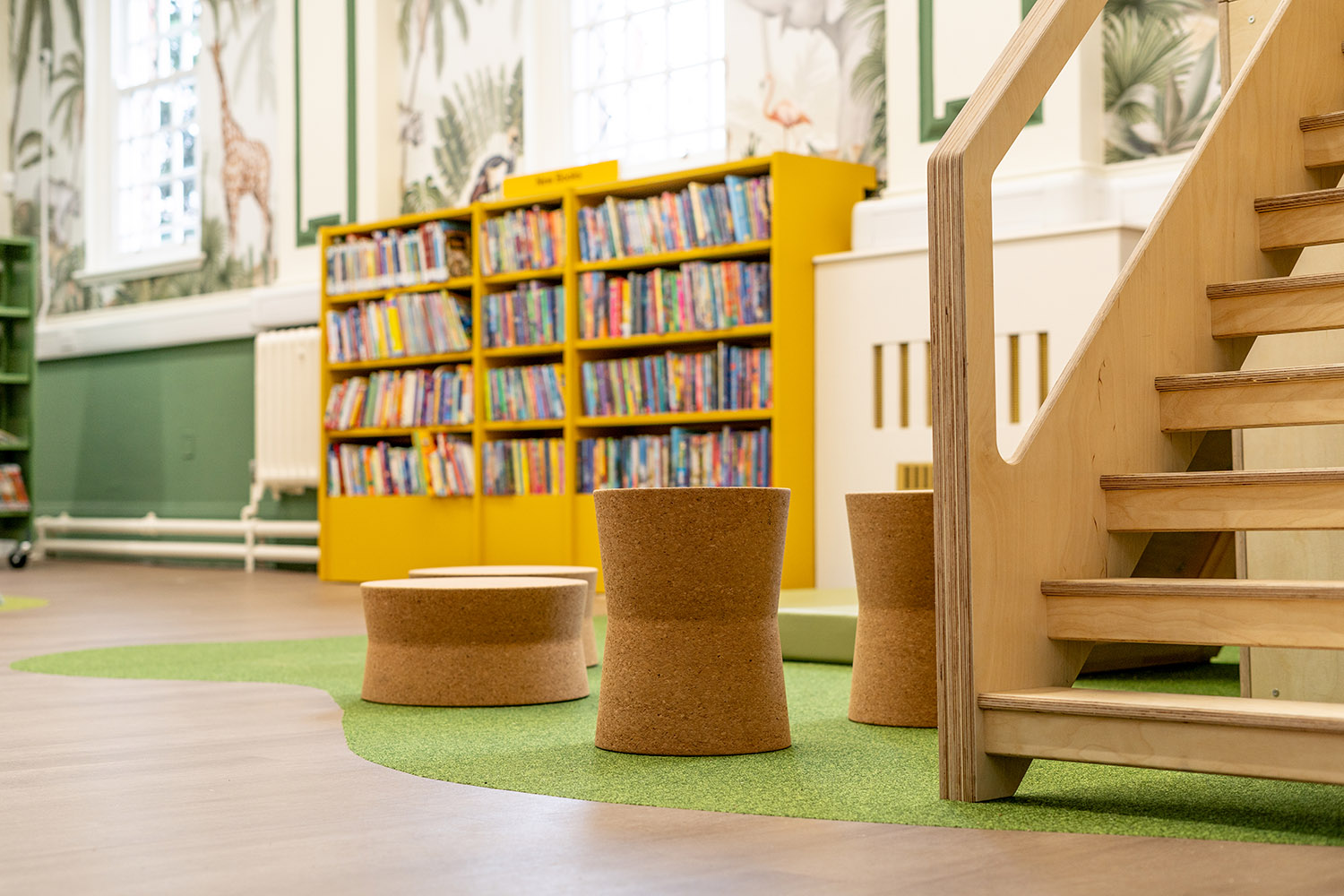 La section jeunesse de la bibliothèque enchante les visiteurs avec un espace de jeu inspiré du thème de la jungle, conçue pour stimuler la créativité et l’apprentissage grâce à des installations interactives. Des couleurs vives, du mobilier sur mesure et des rayonnages accessibles offrent un cadre accueillant et inclusif pour les enfants.