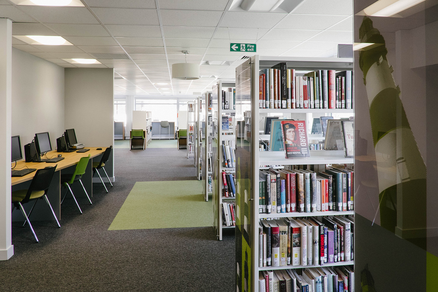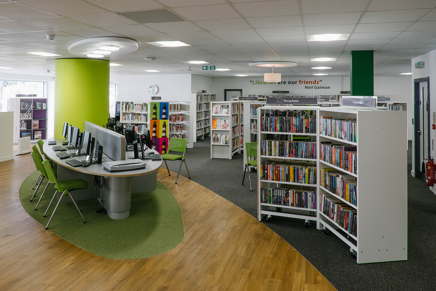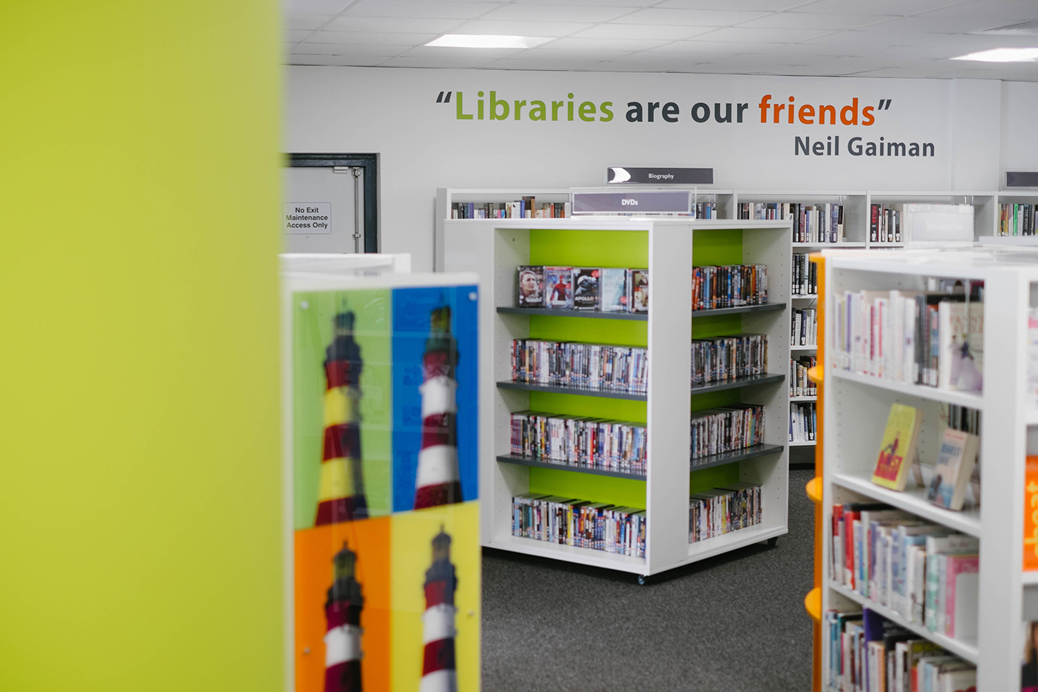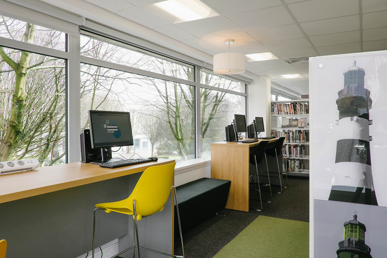 À l’inverse, le premier étage a été conçu tel un endroit calme, propice à l’étude, bien qu’on y retrouve des représentations de phares inspirées de Warhol comme au rez-de-chaussée, afin d’assurer la continuité du graphisme de la bibliothèque.
