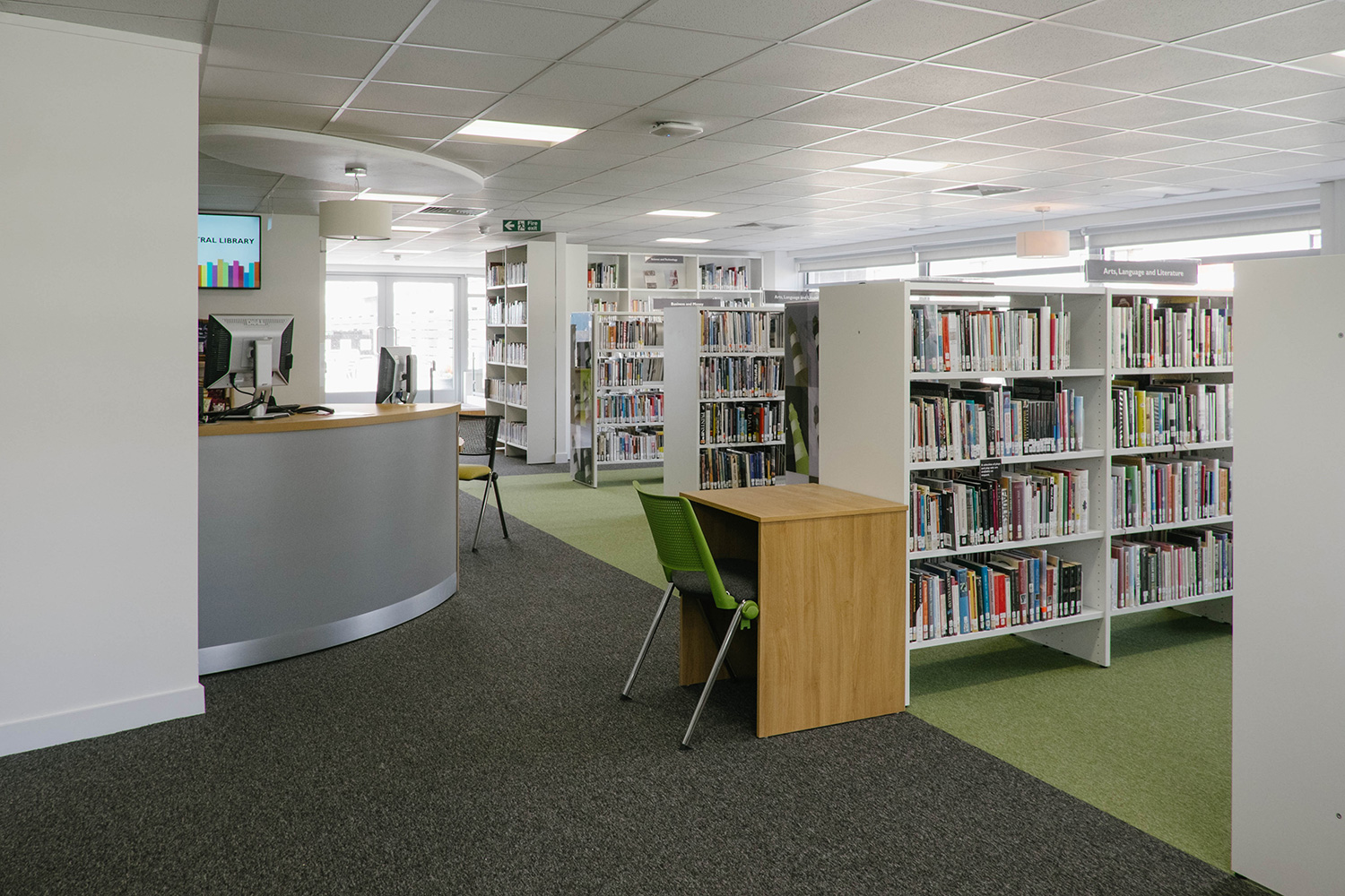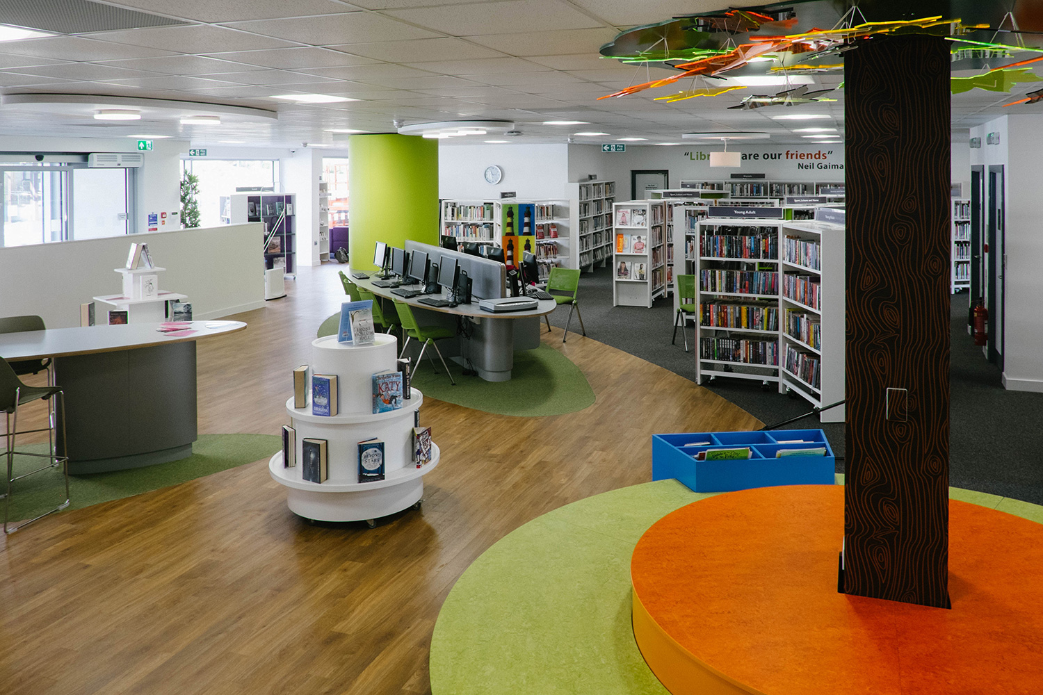 La bibliothèque devait, après déménagement, ouvrir à nouveau ses portes au cœur de la ville et de ses commerces. C’est avec enthousiasme que thedesignconcept a mis en œuvre l’idée d’une bibliothèque qui retiendrait l’attention des visiteurs et les inciterait à y pénétrer. La conception de la bibliothèque s’est développée autour de l’« l'arbre de la connaissance» de la zone réservée aux enfants, entouré de meubles aux couleurs chatoyantes et d’illustrations originales qui créent une atmosphère chaleureuse et accueillante pour tous les visiteurs.