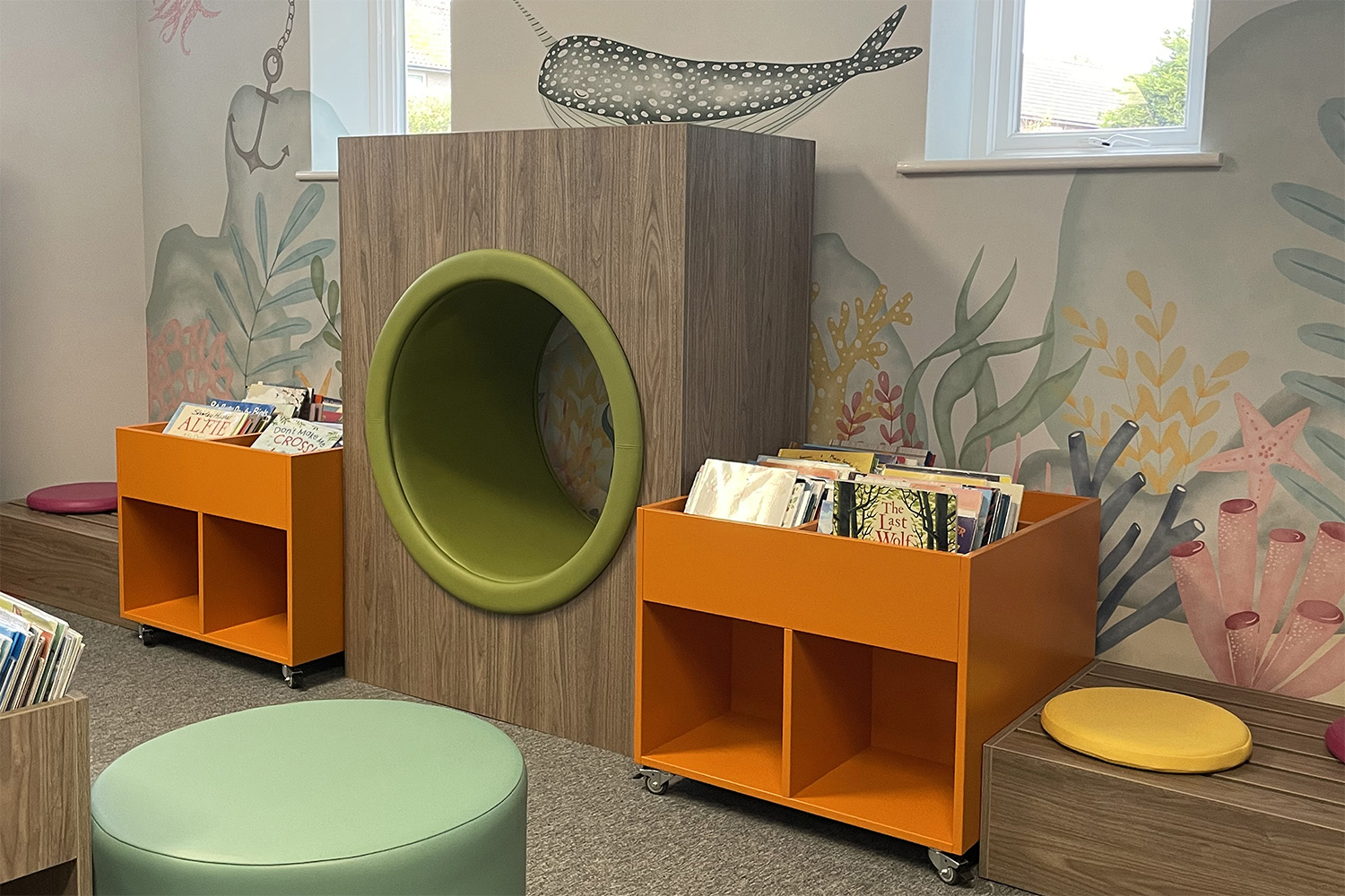 La bibliothèque jeunesse est ludique, vivante et ouverte à tous. Elle permet aux enfants de participer à des séances de lecture d'histoires grâce à un espace scénique de faible hauteur conçu sur mesure. La consultation des ouvrages est facilitée par l'utilisation de bacs à livres, de meubles bas et d'étagères murales. L'espace enfants est un ensemble fabuleux, amusant et attrayant. Les étagères séparent cet espace pour donner une impression d'intimité. Les livres et albums peuvent ainsi être lus en toute liberté. Un coin conçu comme un cocon de style tipi/montagne crée un lieu douillet pour la lecture. Il s'accorde parfaitement avec le panneau décoratif de montagne sur le mur du fond. Il y a aussi un ensemble d'assises pour « lire ensemble ». Le choix judicieux des revêtements et tissus dans toute la bibliothèque permet de créer un lien naturel entre toutes les zones.