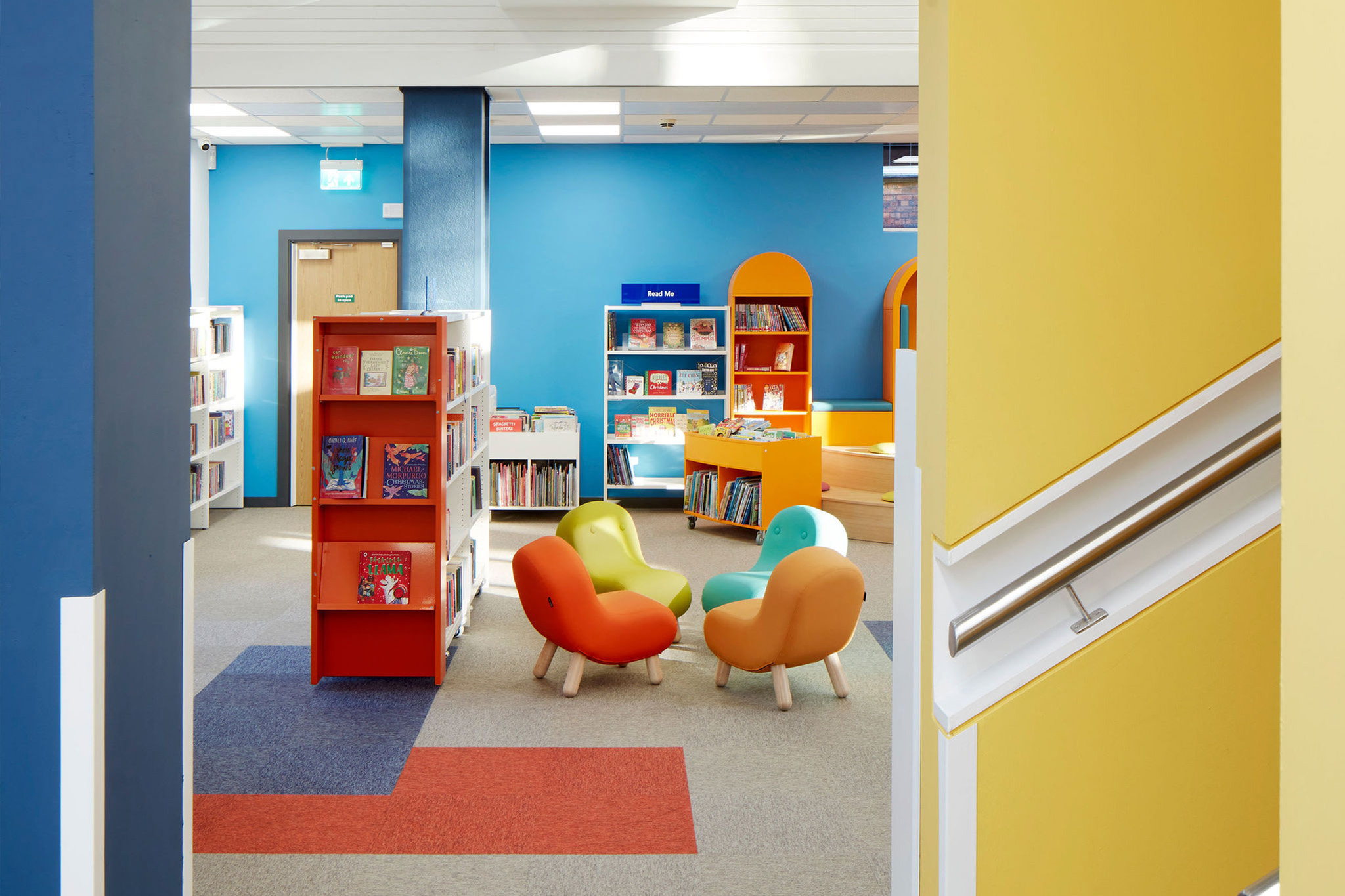 Dans un souci de gestion durable, notre premier objectif a été d'identifier les éléments de la bibliothèque existante susceptibles d'être recyclés. Tous les rayonnages du premier étage et toutes les étagères murales du rez-de-chaussée ont été réutilisés et relookés avec de nouveaux panneaux d'extrémité colorés et graphiques. L'ensemble a été complété par la mise en place de notre système d'étagères Lingo, toutes équipées de roulettes, pour une plus grande flexibilité.