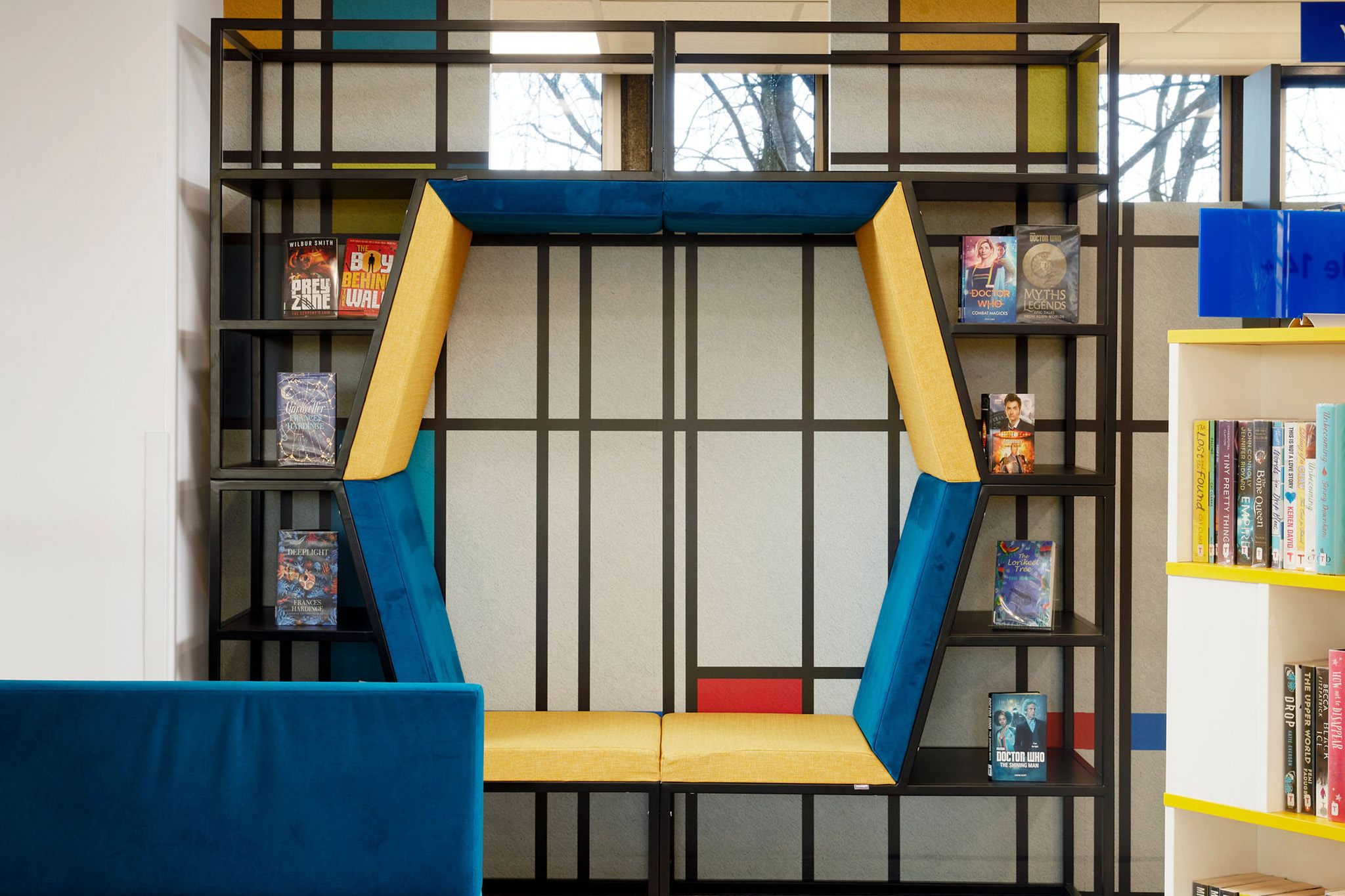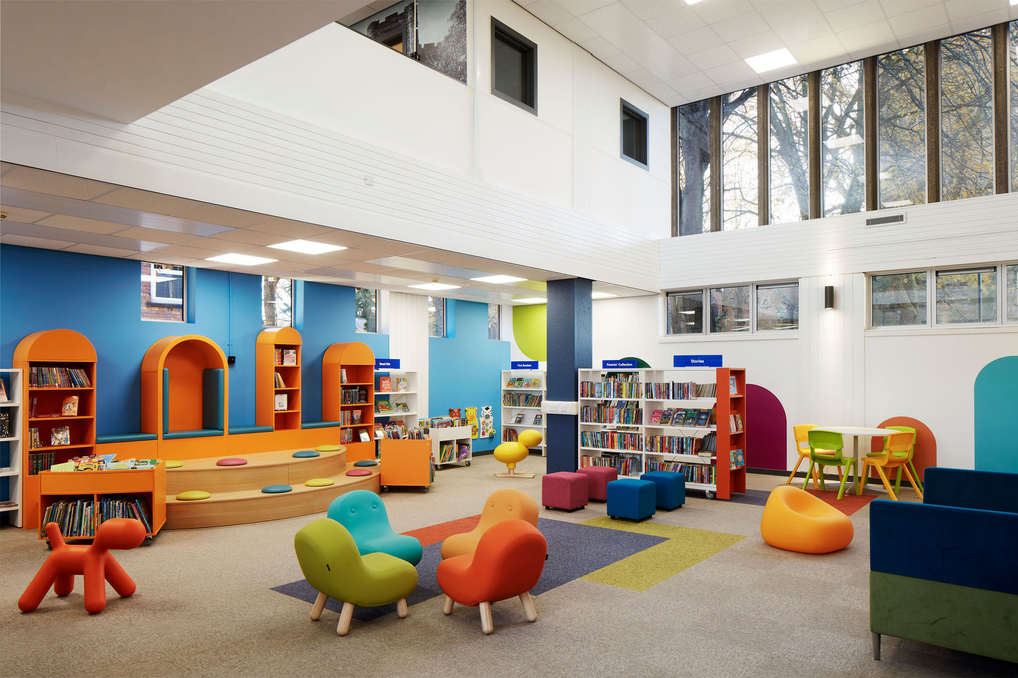 L'espace jeunesse est joyeux et attrayant, avec des couleurs vives et des formes amusantes conçues pour inciter les enfants à entrer dans la bibliothèque et les encourager à explorer la grande diversité de livres. L'espace scénique, fabriqué sur mesure, est exceptionnellement plurifonctionnel et permet des activités de lecture individuelles ou en groupe. L'intégration d'éléments sensoriels dans la conception de l'espace pour enfants était vraiment importante pour s'assurer que le lieu soit inclusif et accueillant pour toutes les familles.