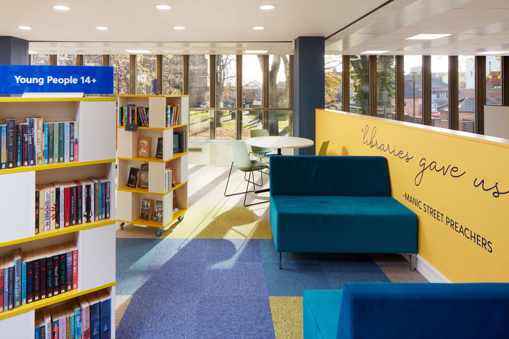 Nous voulions également nous assurer que les adolescents se sentent les bienvenus, et l'espace créé pour eux leur permet de se détendre sur des canapés confortables mais aussi de s'asseoir et d'étudier. La présence d'une grande diversité d'assises permet aux adolescents de lire ou de travailler, individuellement ou en groupe, de la manière qui leur convient le mieux.