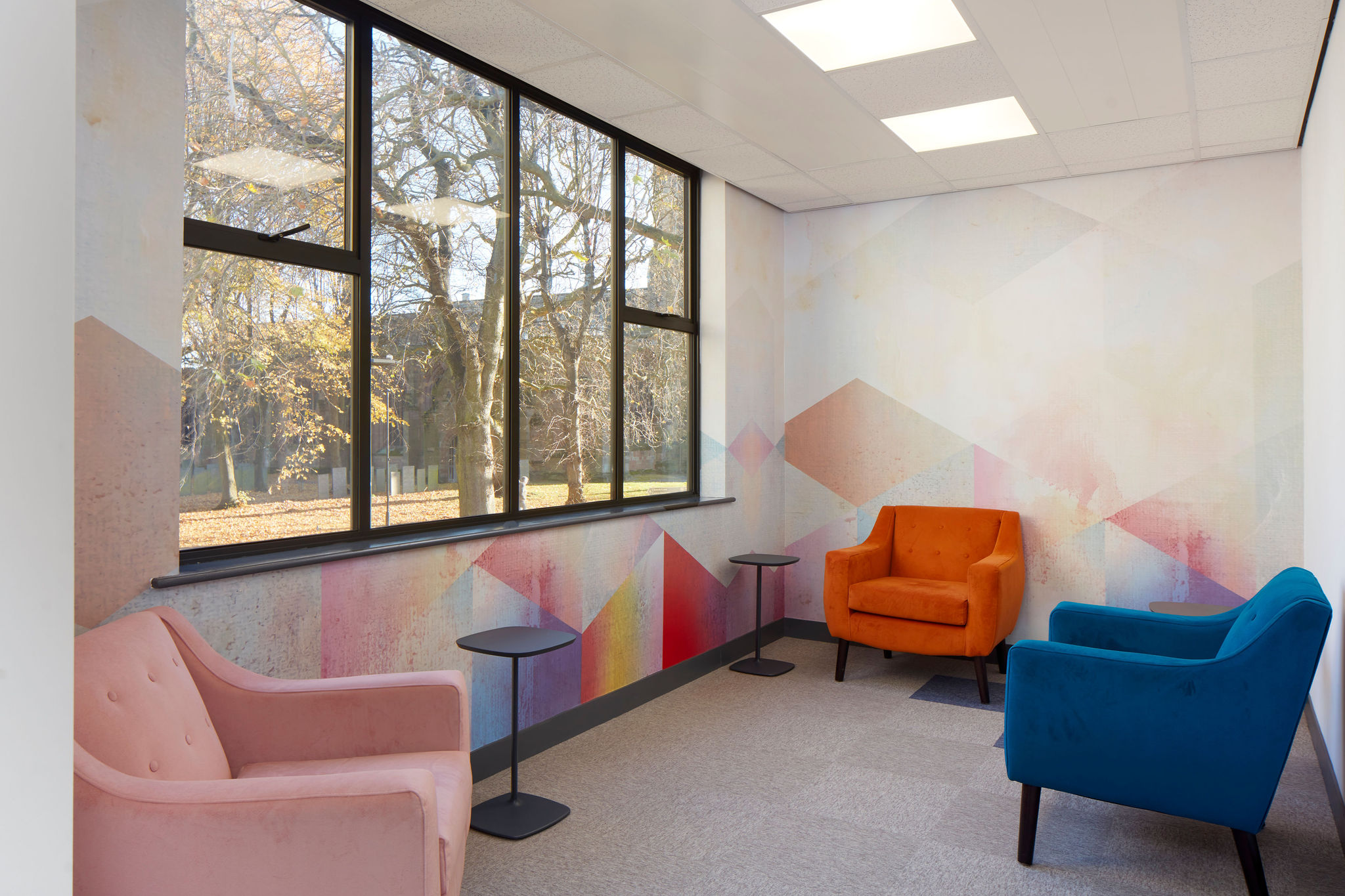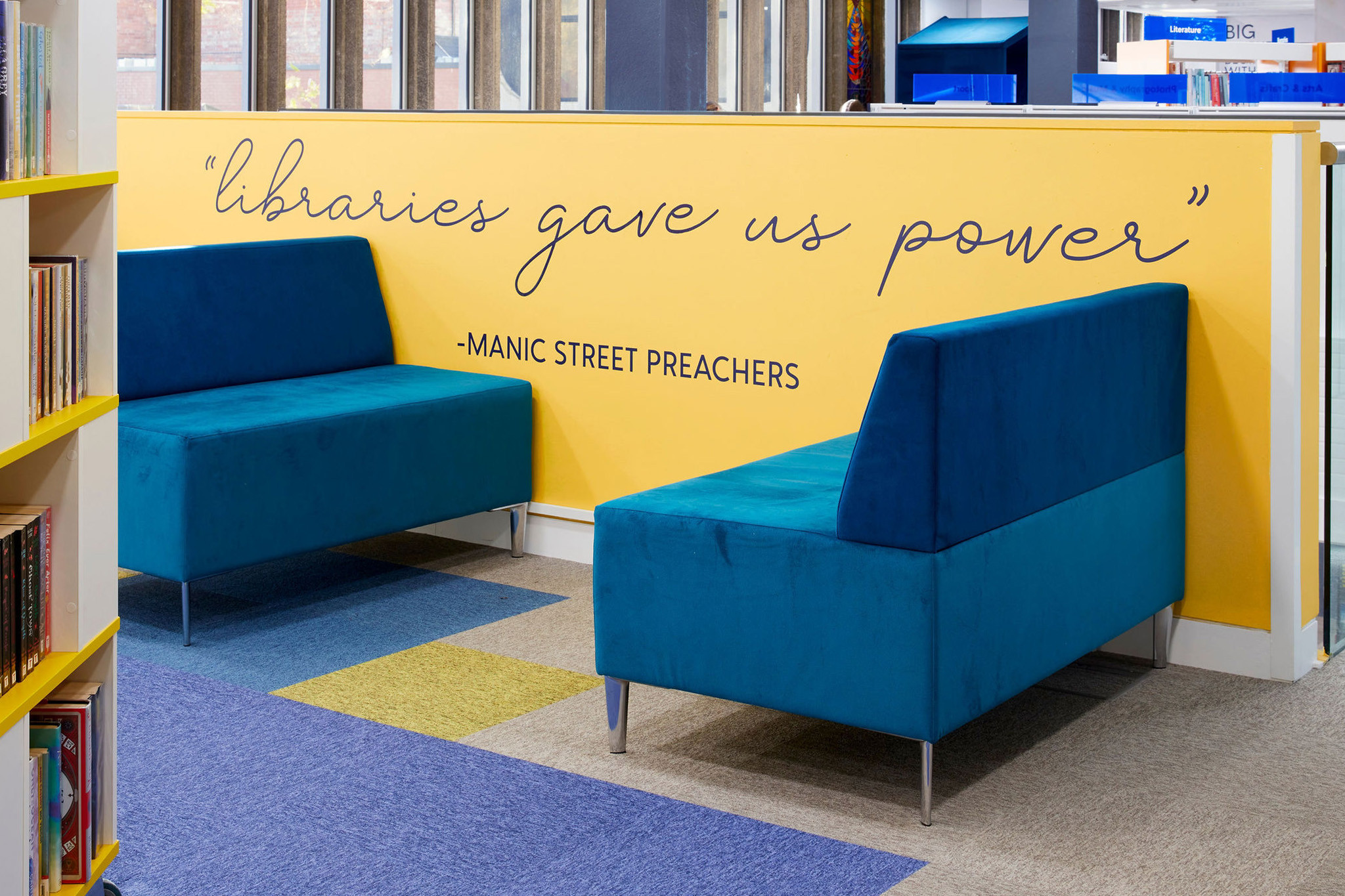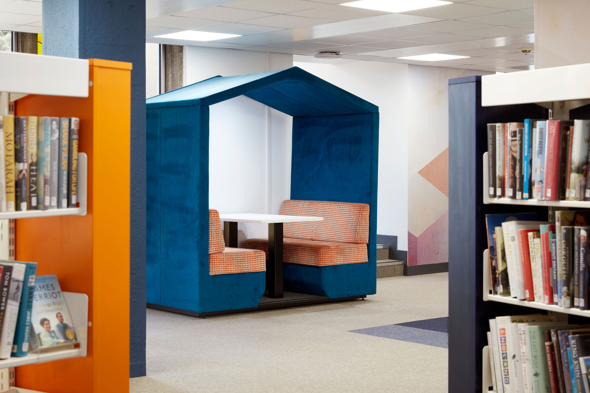 Une attention particulière a été portée à la sélection des tissus et des couleurs pour l'ensemble du mobilier. Thedesignconcept ltd. a sélectionné toutes les couleurs de la bibliothèque et les a agrémentées de graphiques numériques soigneusement sélectionnés et de citations inspirantes qui embellissent l'ambiance générale de l'espace, permettant ainsi aux visiteurs d'être plus positifs et plus enthousiastes. Nous avons imaginé une mise en place de la moquette qui fait appel à un placement aléatoire de couleurs qui s'adaptera à tout autre aménagement futur de l'espace.