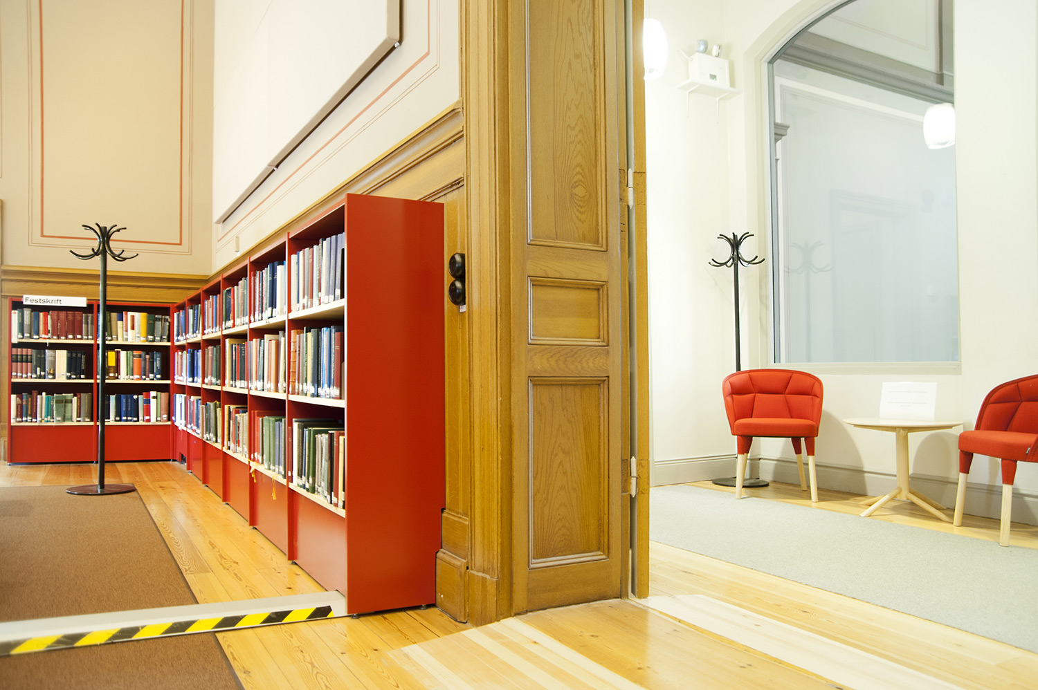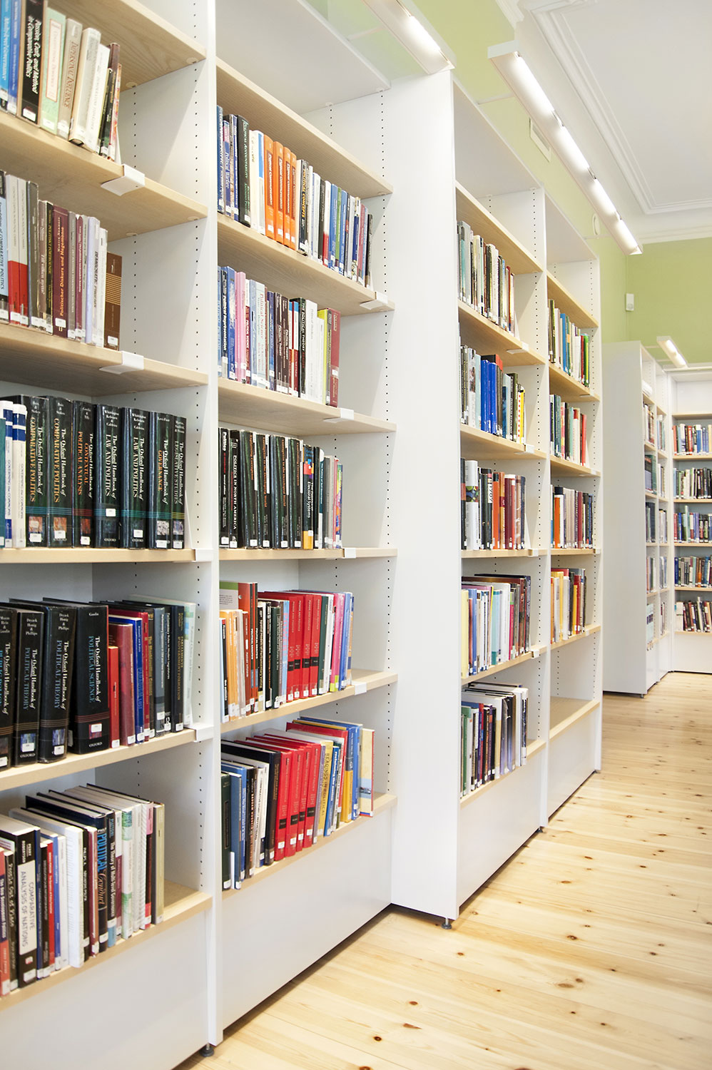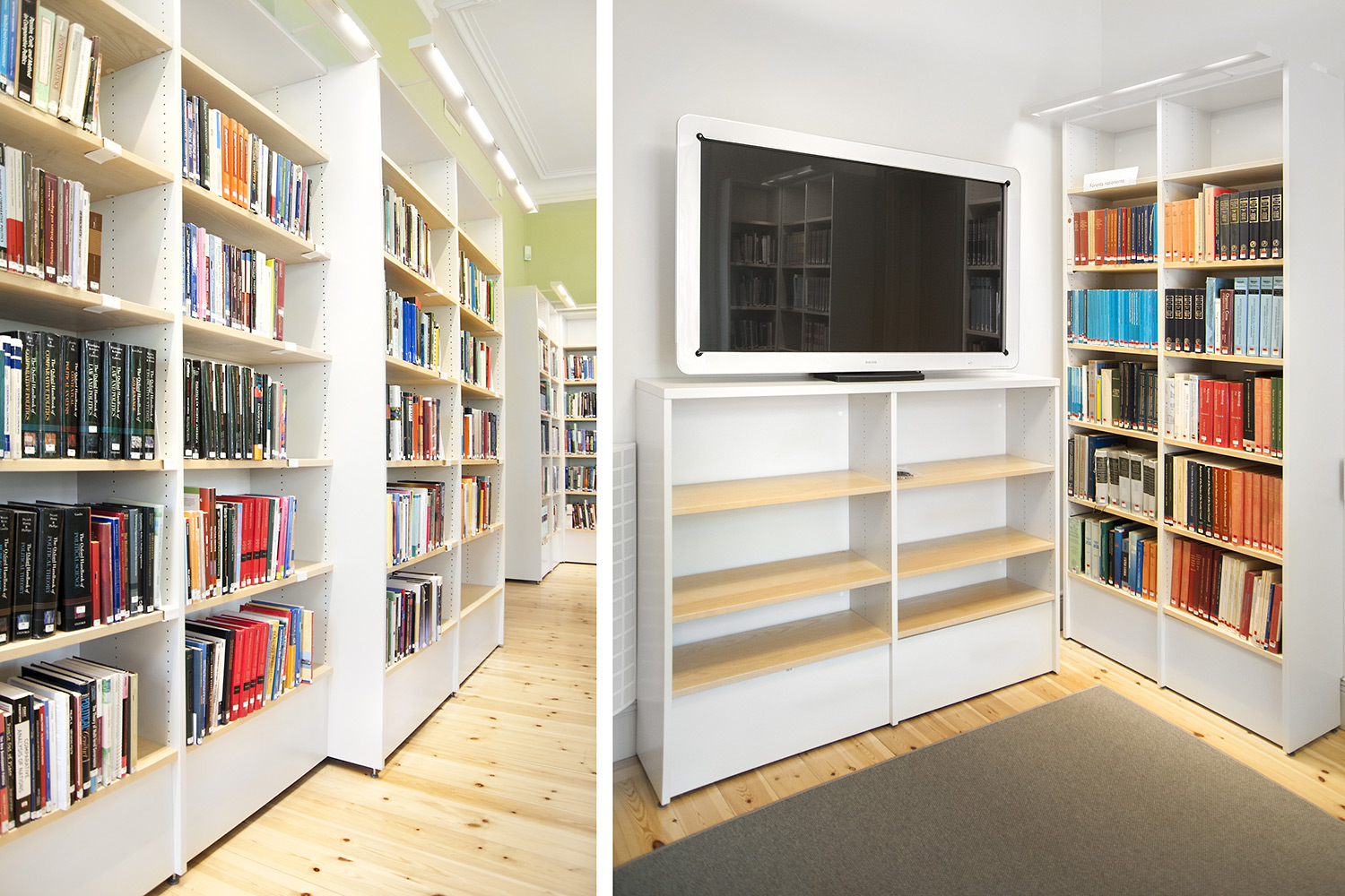 Un bâtiment classé comporte également de nombreux défis en termes d’aménagement intérieur pour une bibliothèque. Les rayonnages doivent en effet s’adapter aux caractéristiques techniques de chaque pièce (tuyauteries, câblages et installation électrique). Le système Frontline habillé de panneaux laqués et de tablettes en frêne a été préconisé pour ce projet : il souligne l’aménagement intérieur tout en répondant aux besoins de la bibliothèque.