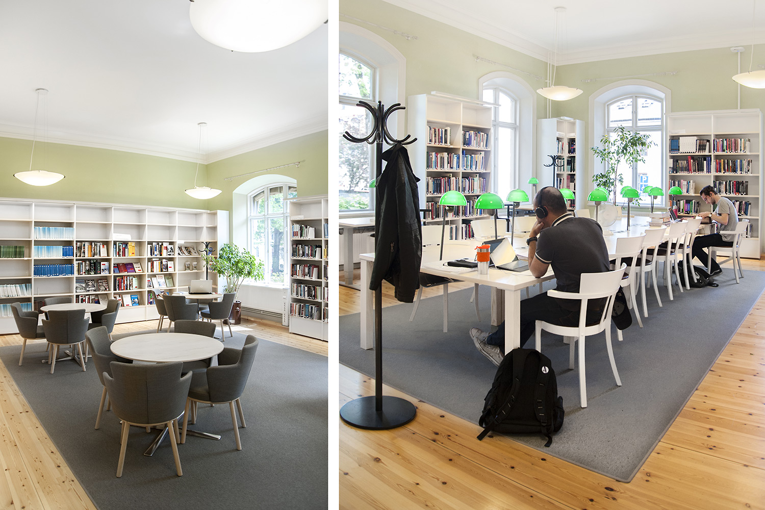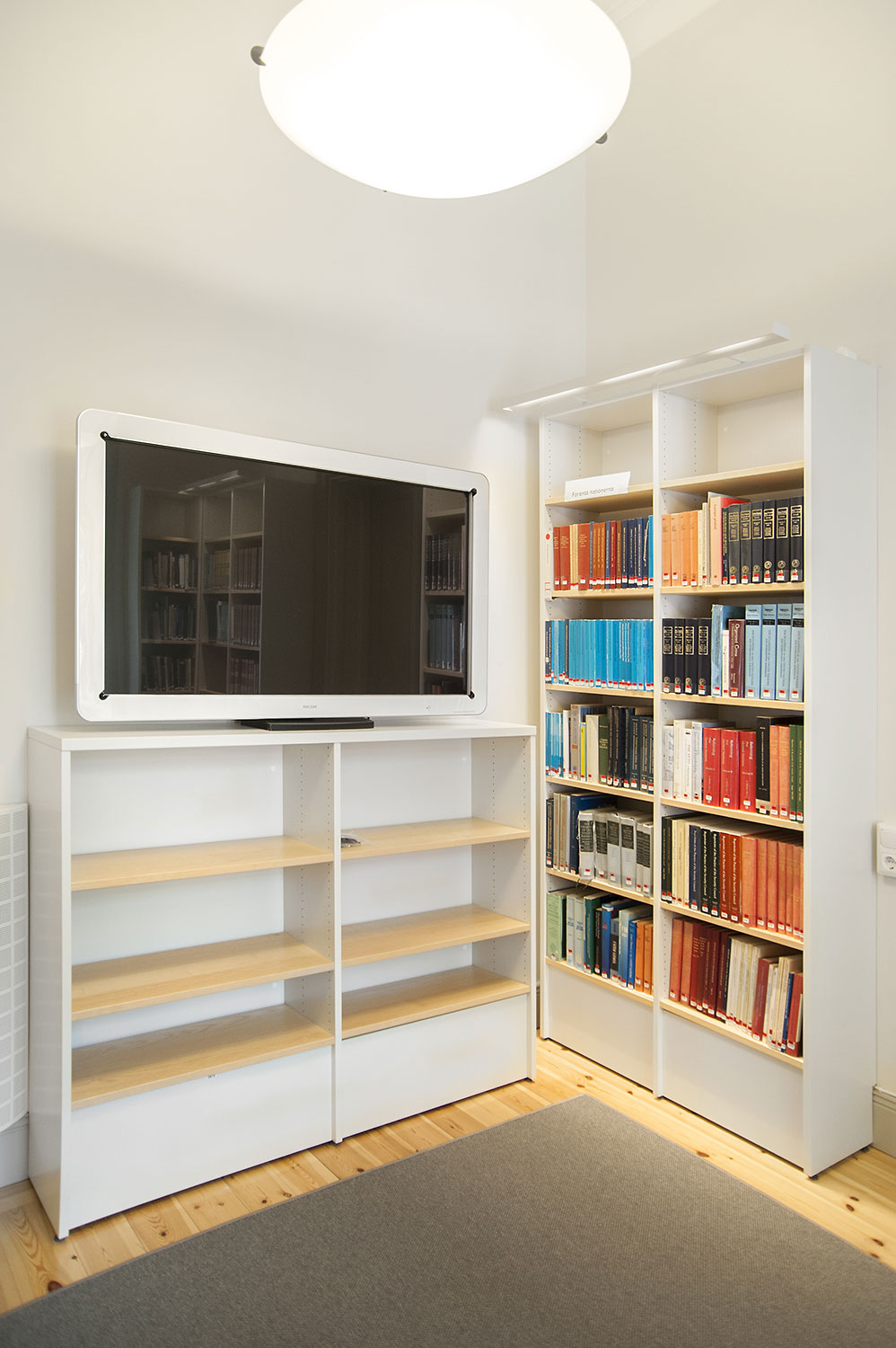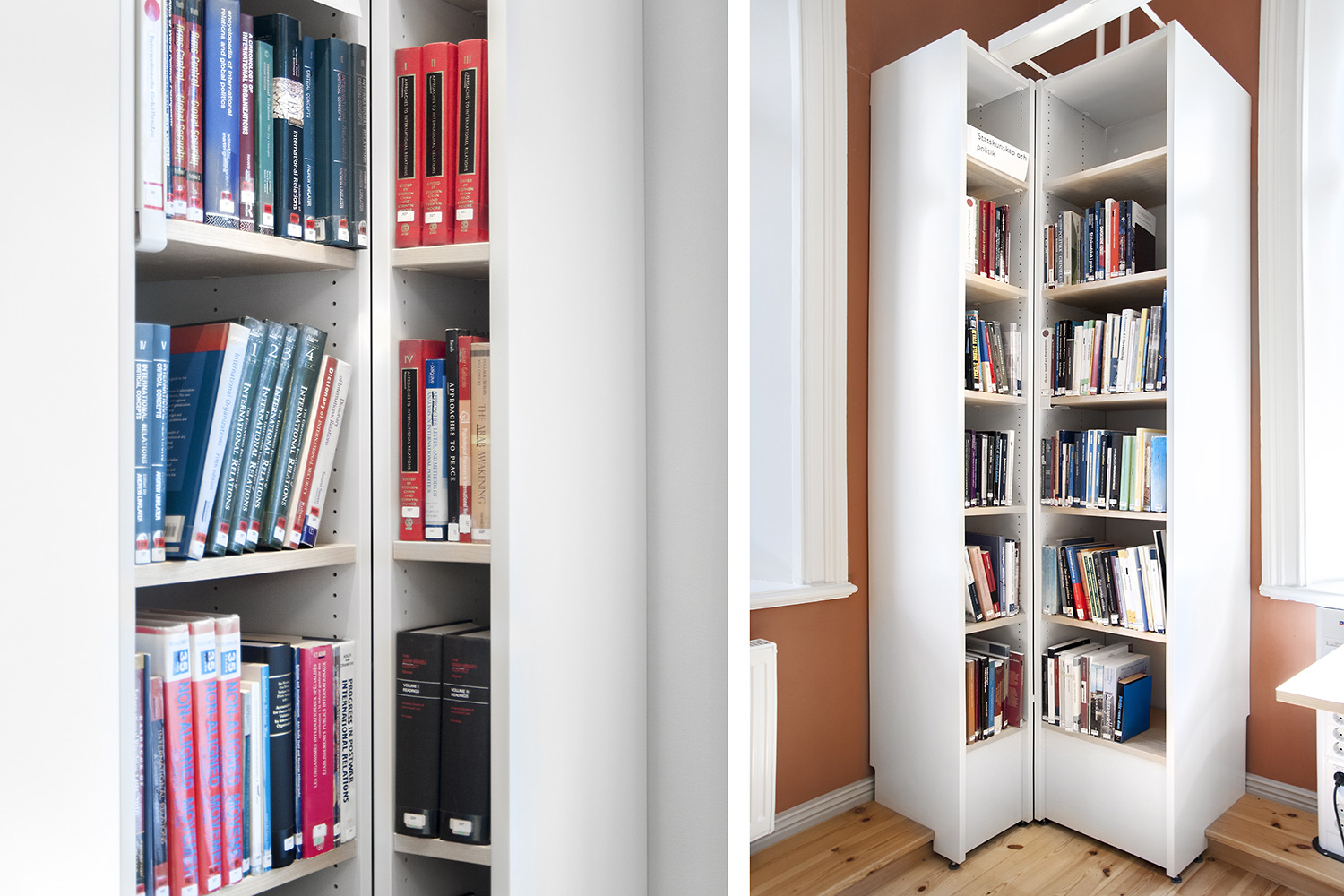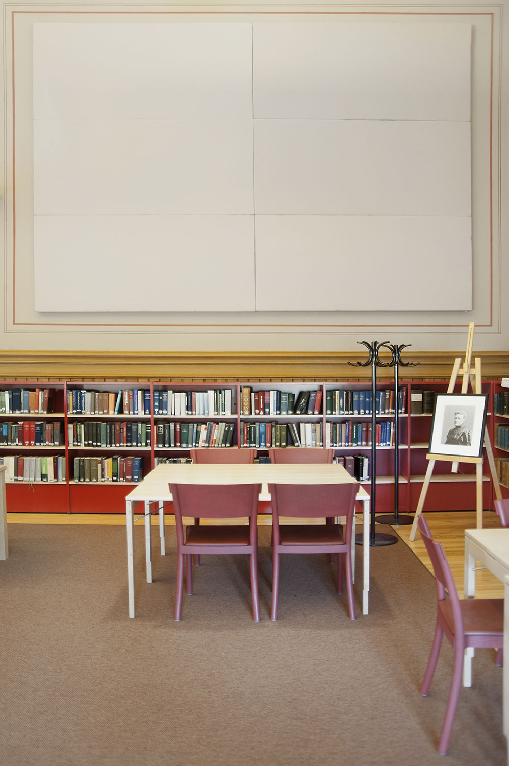 Un bâtiment classé comporte également de nombreux défis en termes d’aménagement intérieur pour une bibliothèque. Les rayonnages doivent en effet s’adapter aux caractéristiques techniques de chaque pièce (tuyauteries, câblages et installation électrique). Le système Frontline habillé de panneaux laqués et de tablettes en frêne a été préconisé pour ce projet : il souligne l’aménagement intérieur tout en répondant aux besoins de la bibliothèque.