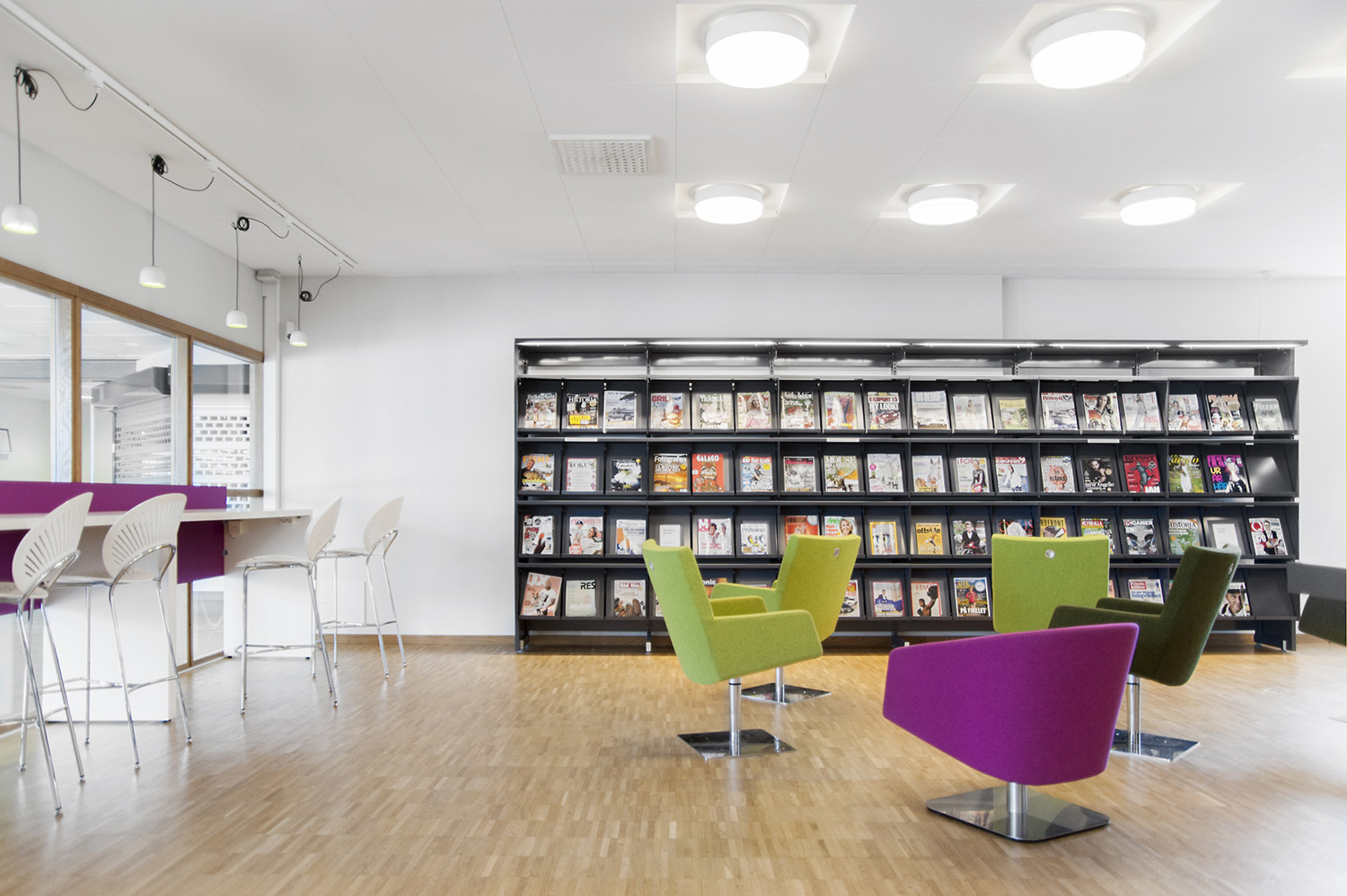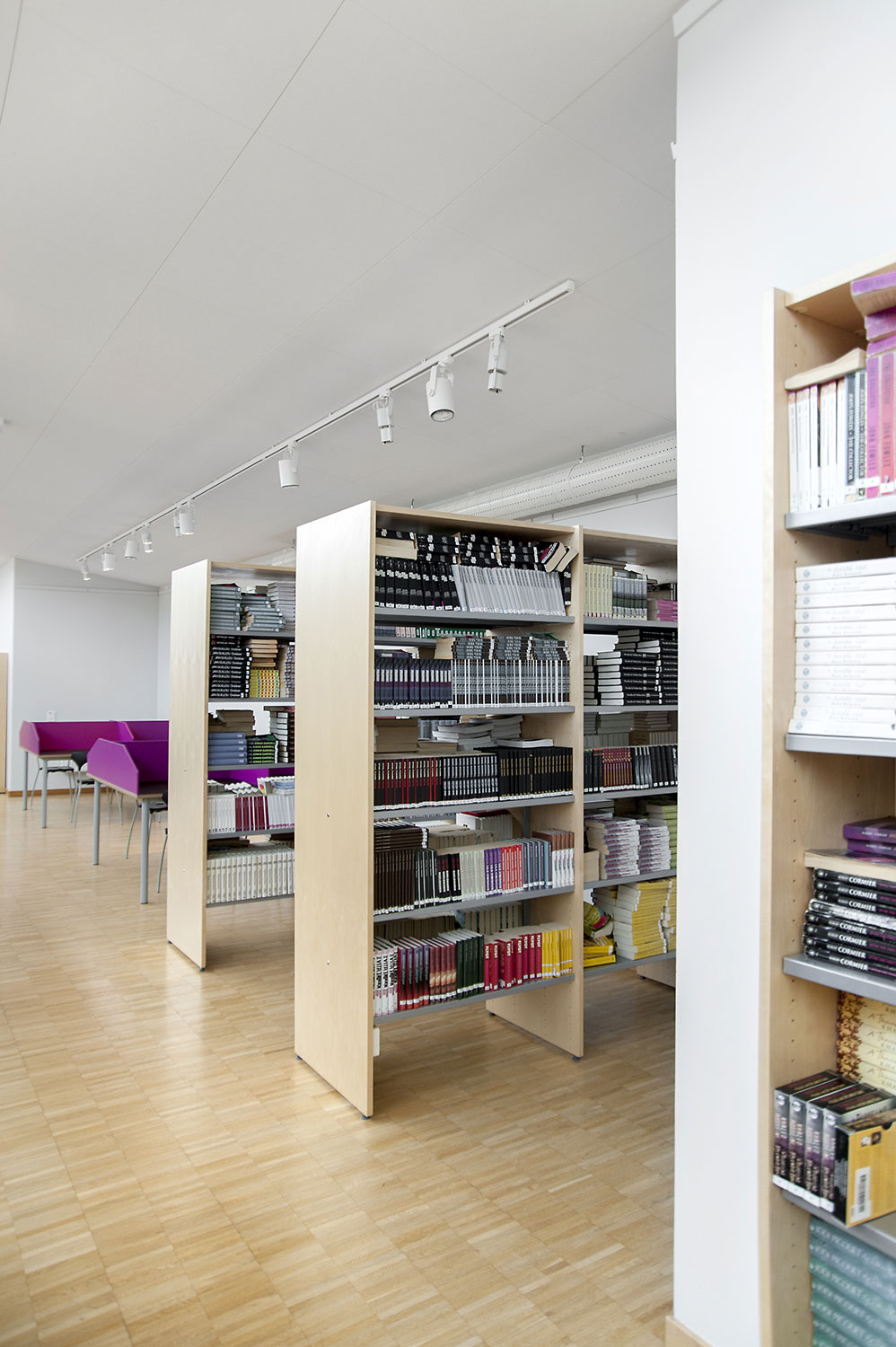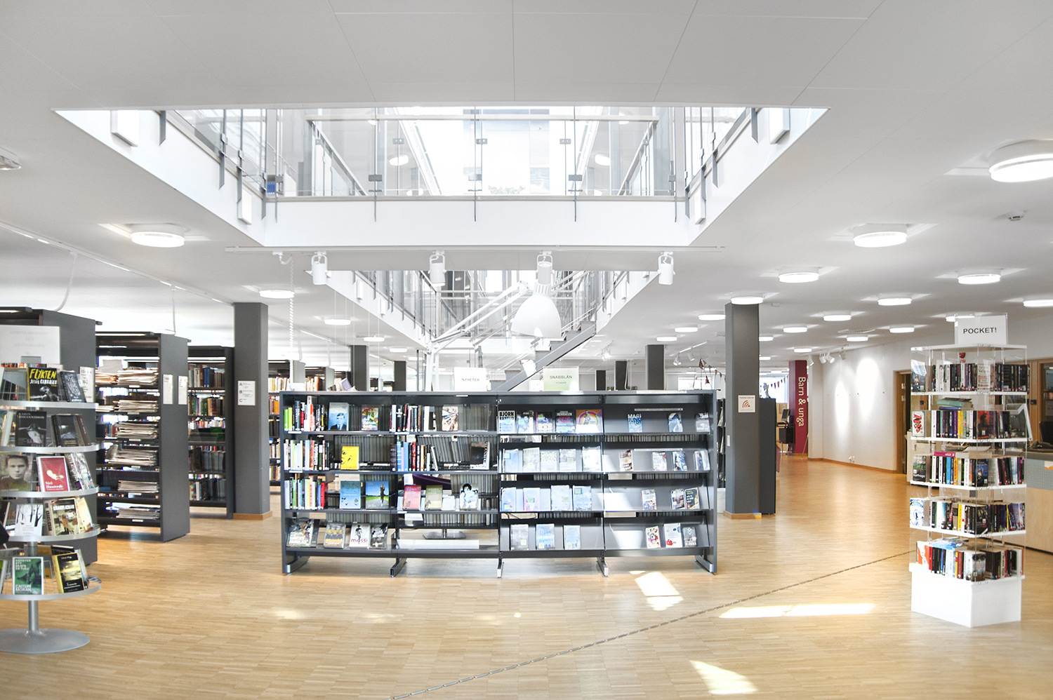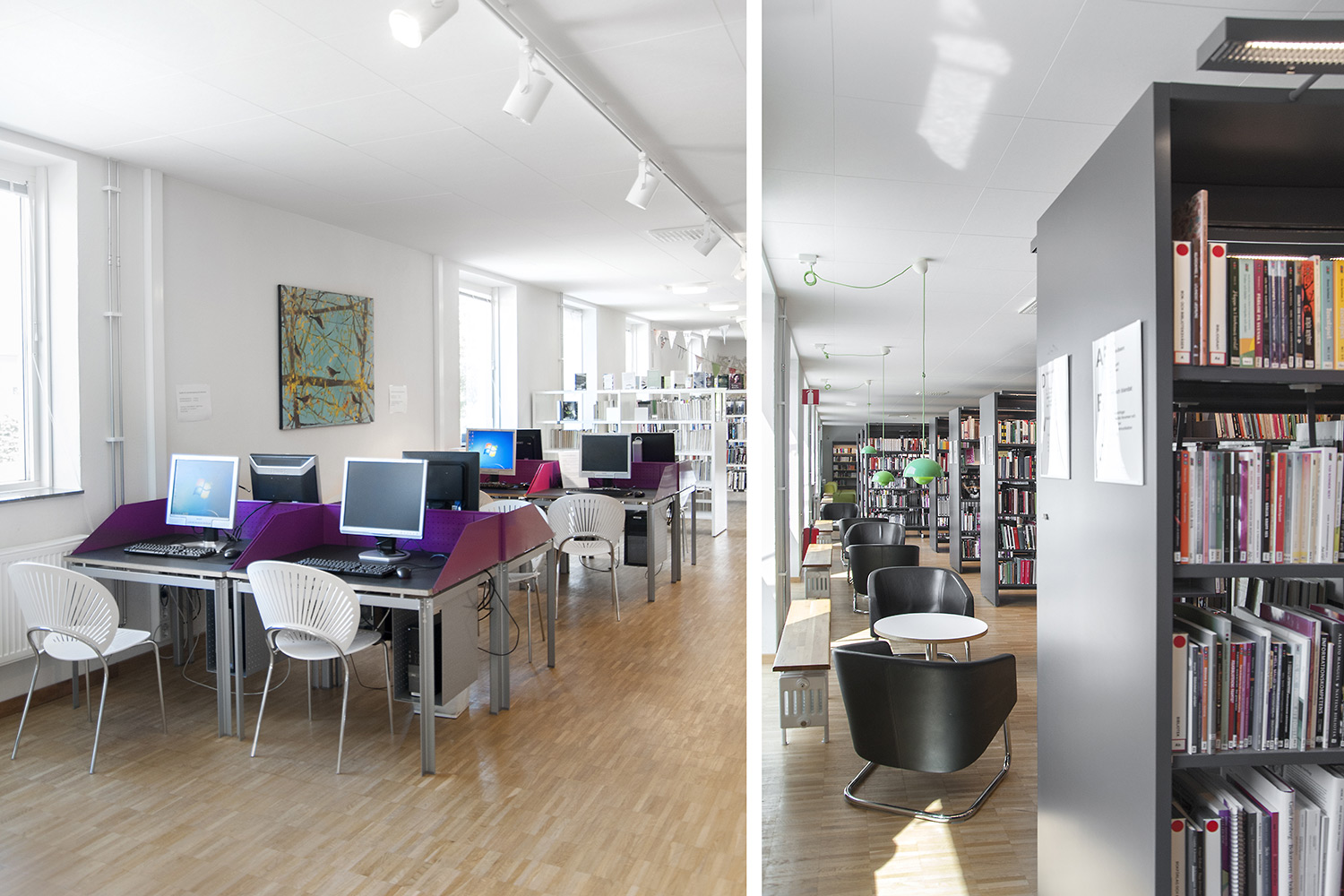 Cette bibliothèque est à la fois une bibliothèque publique et une bibliothèque scolaire intégrée à la Sunds High School de la municipalité de Vellinge. Son caractère spacieux et l’opportunité de pouvoir à la fois y étudier et se détendre en font un excellent environnement de travail pour les étudiants et les citoyens.