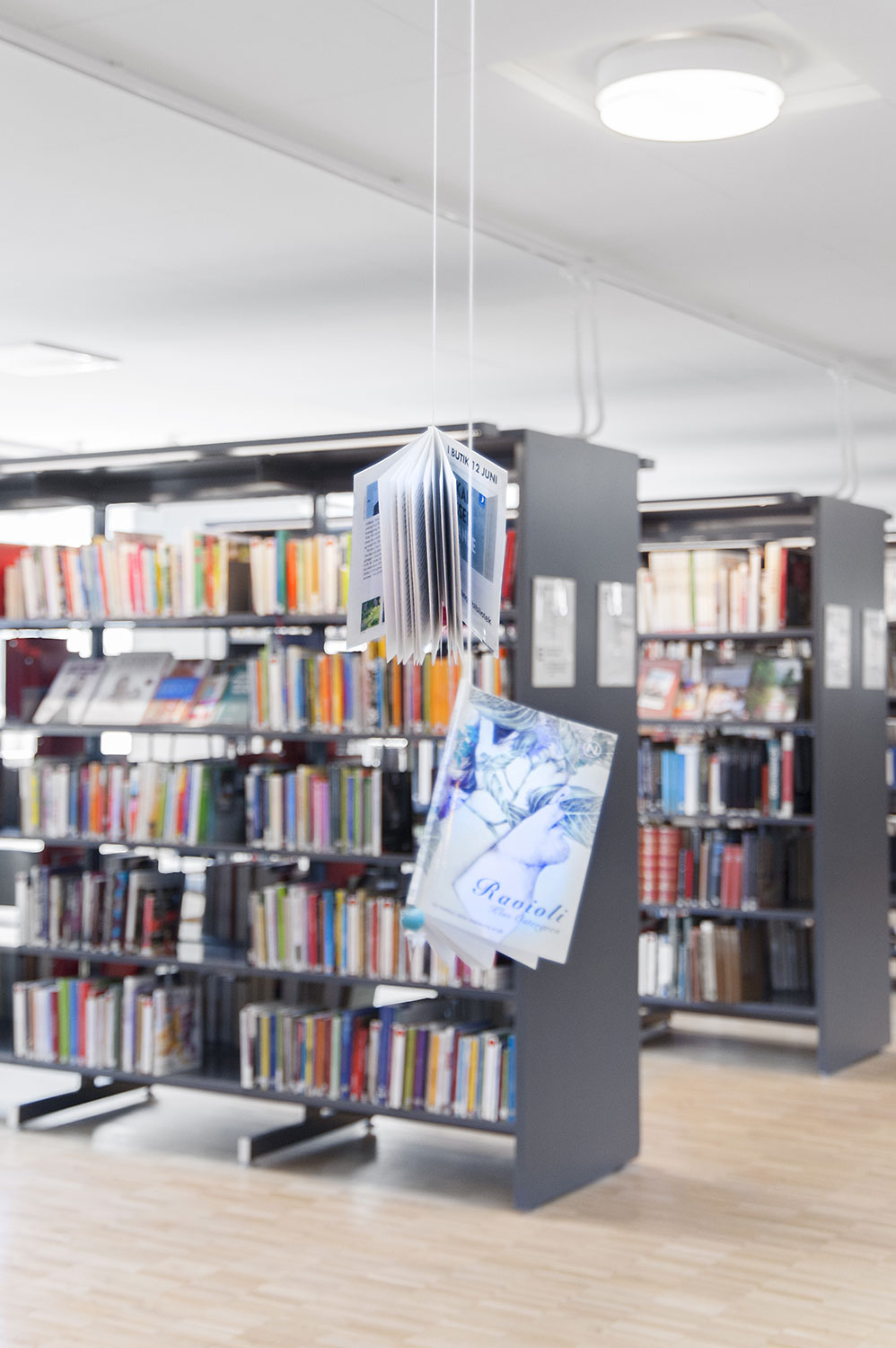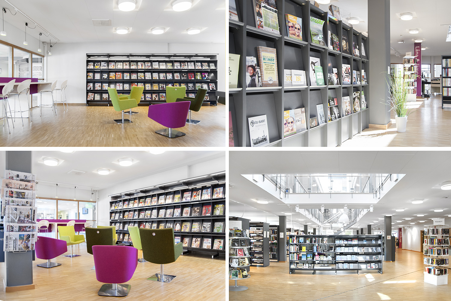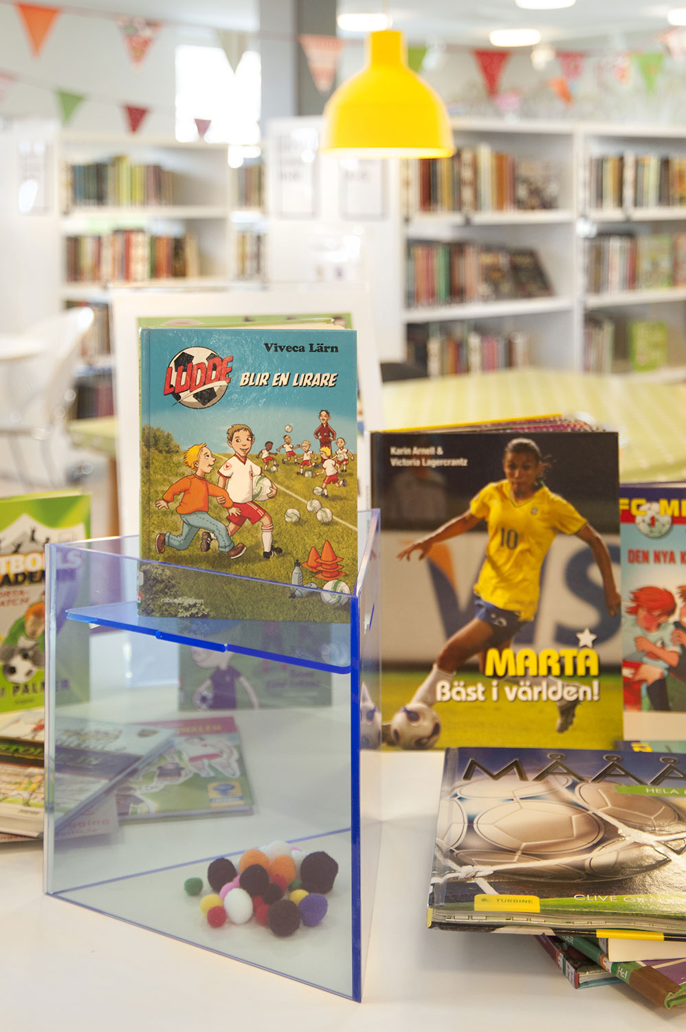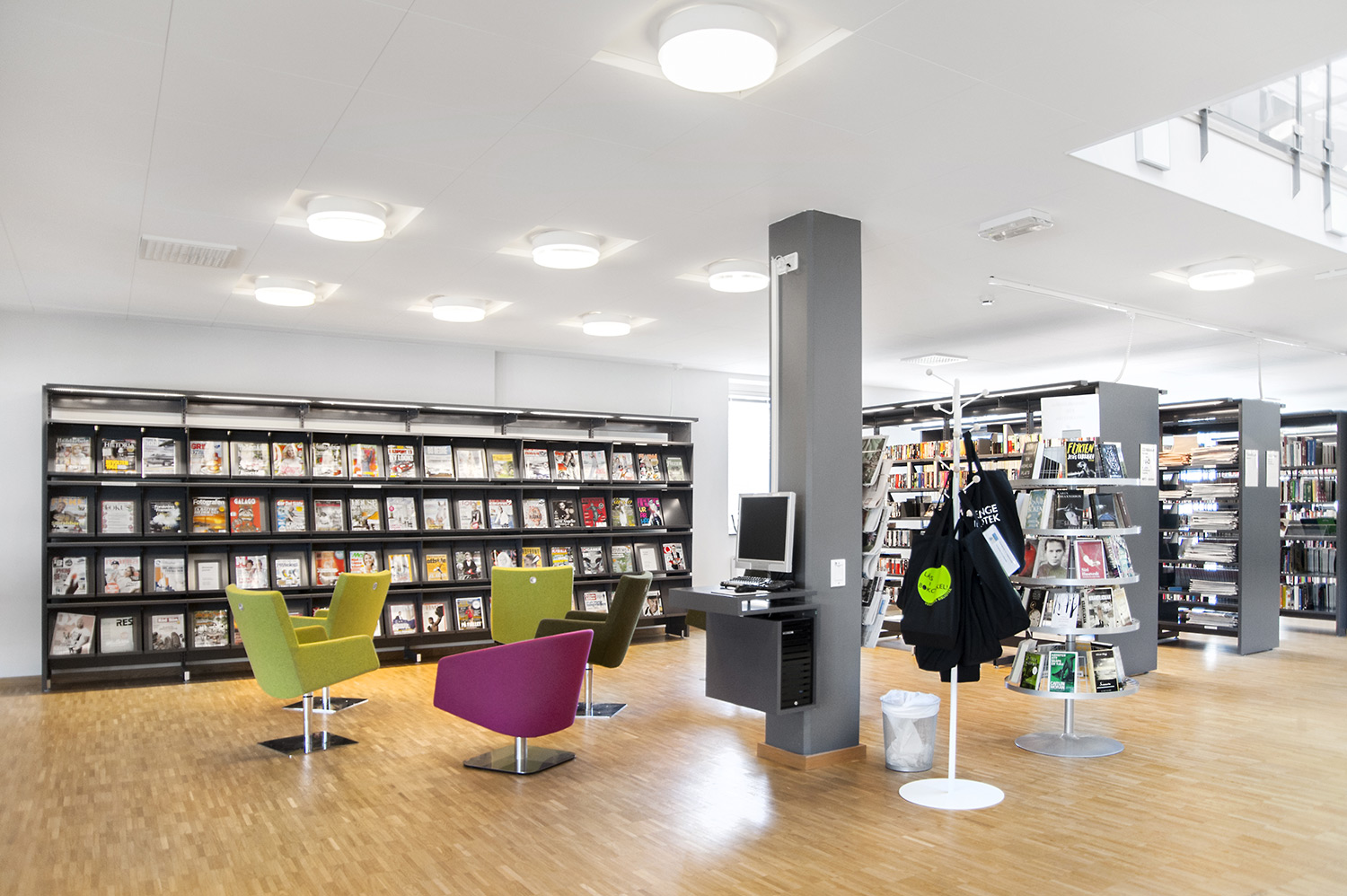 Cette bibliothèque est à la fois une bibliothèque publique et une bibliothèque scolaire intégrée à la Sunds High School de la municipalité de Vellinge. Son caractère spacieux et l’opportunité de pouvoir à la fois y étudier et se détendre en font un excellent environnement de travail pour les étudiants et les citoyens.