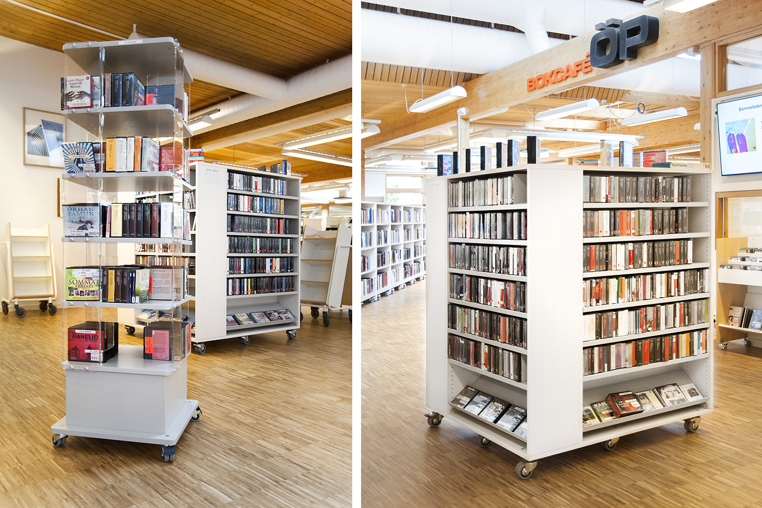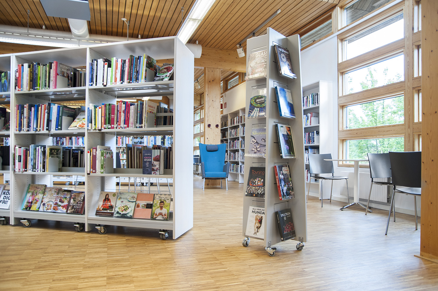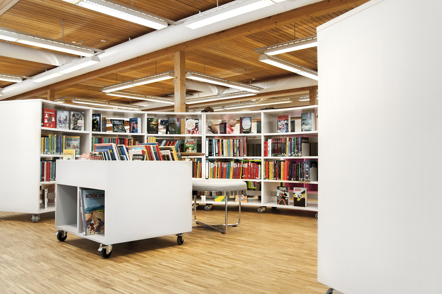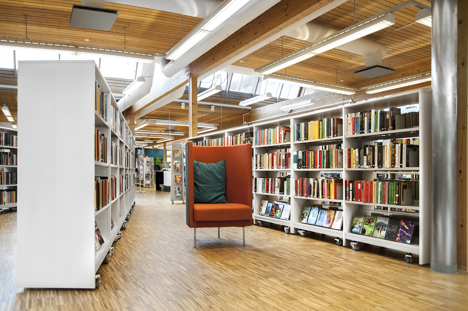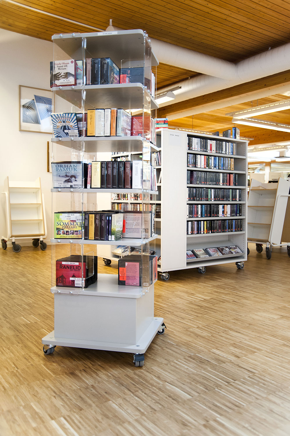 Tous les systèmes de rayonnages Frontline ont été montés sur roulettes pour une plus grande flexibilité. Ils peuvent ainsi être déplacés lors de conférences et d’événements culturels. Les superbes armoires pour les magazines Ordrup sont un des points focaux de la bibliothèque. Leur agencement bien étudié permet d’accéder facilement à leur contenu, tandis que des postes infos avec éclairage LED intégré ont été placés près de l’entrée pour permettre aux utilisateurs de rechercher des informations ou demander de l’aide auprès des bibliothécaires. Les tours de livres sur roulettes sont quant à elles utilisées pour exposer des livres audio.