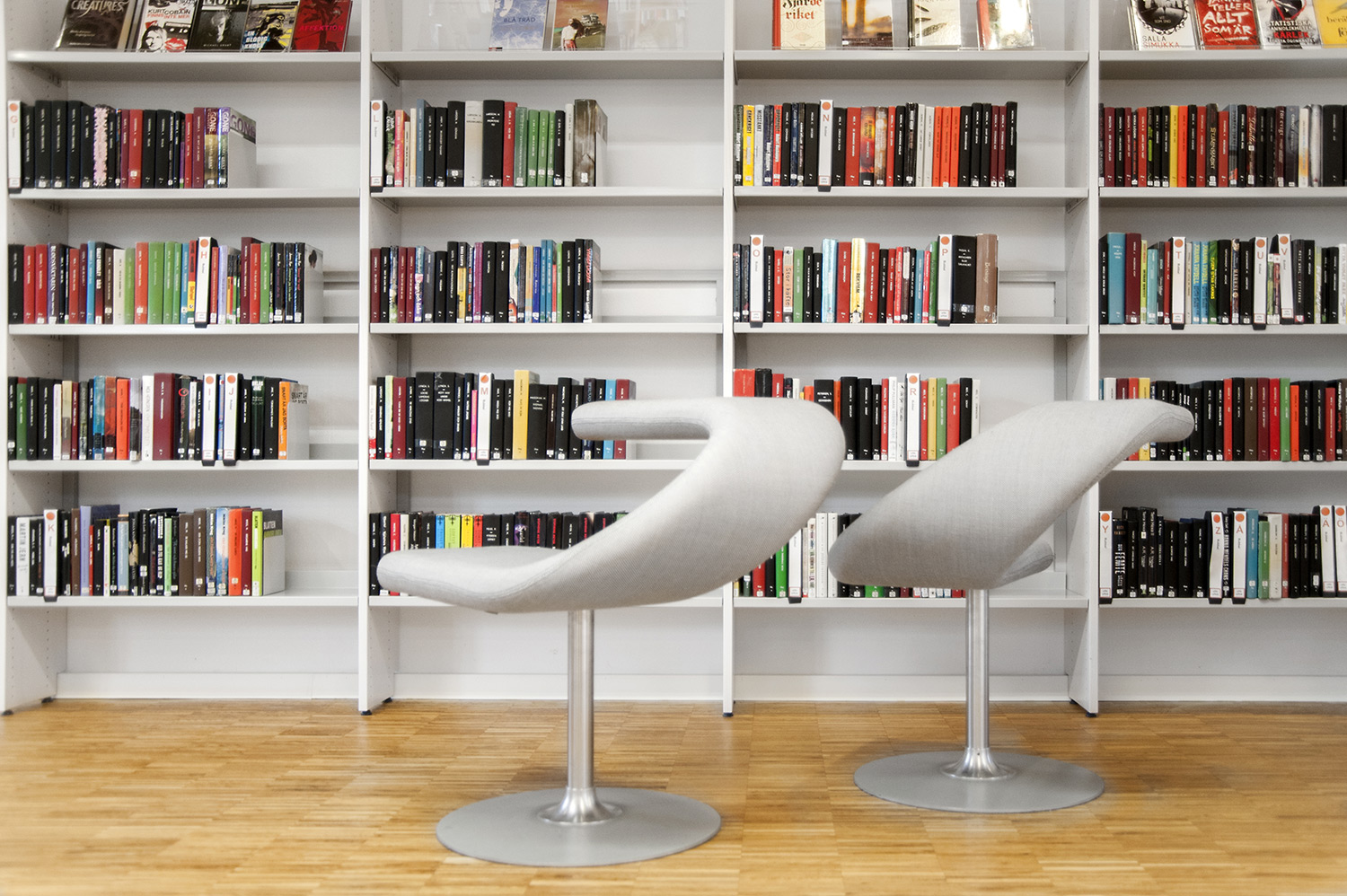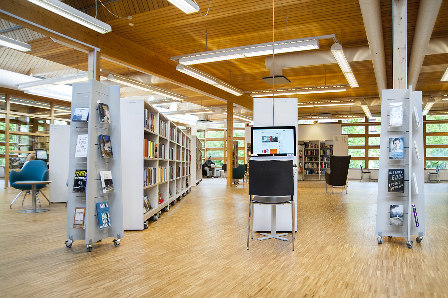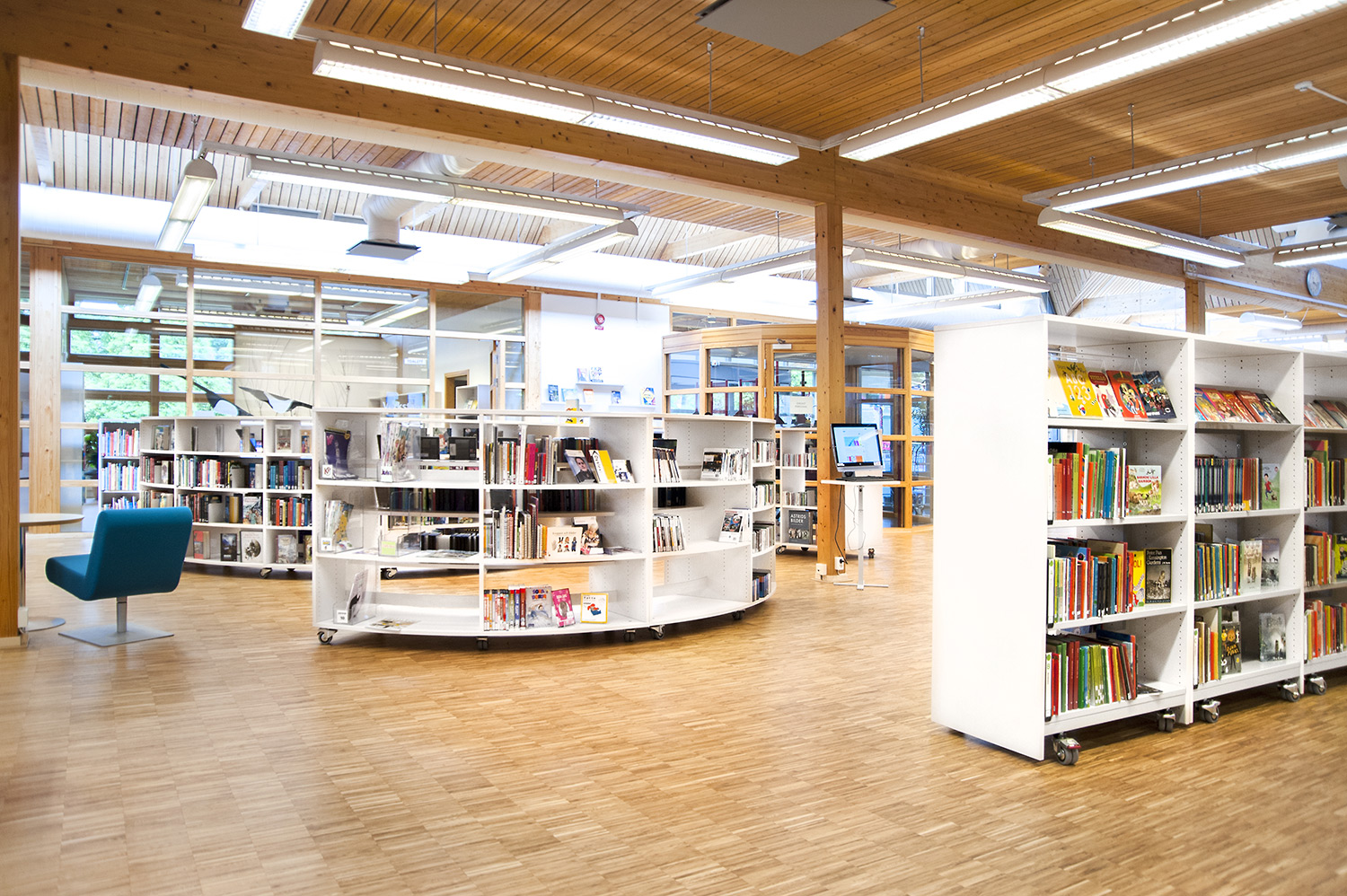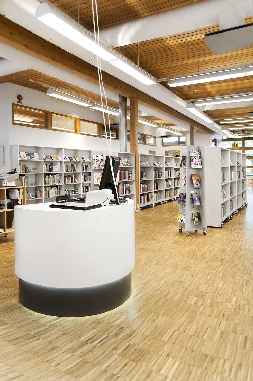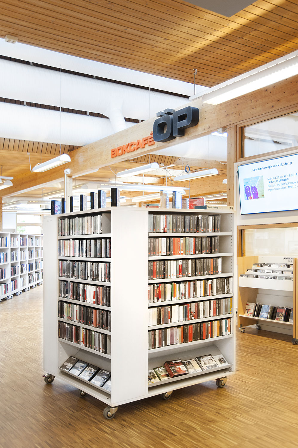 Tous les systèmes de rayonnages Frontline ont été montés sur roulettes pour une plus grande flexibilité. Ils peuvent ainsi être déplacés lors de conférences et d’événements culturels. Les superbes armoires pour les magazines Ordrup sont un des points focaux de la bibliothèque. Leur agencement bien étudié permet d’accéder facilement à leur contenu, tandis que des postes infos avec éclairage LED intégré ont été placés près de l’entrée pour permettre aux utilisateurs de rechercher des informations ou demander de l’aide auprès des bibliothécaires. Les tours de livres sur roulettes sont quant à elles utilisées pour exposer des livres audio.
