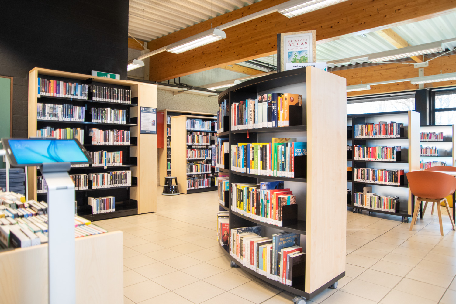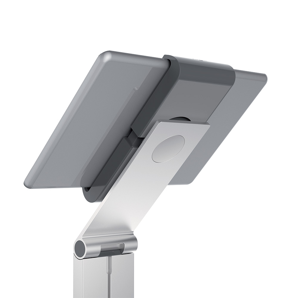 Porte-tablette pour placement sur un comptoir ou bureau. Cela permet d'utiliser votre tablette comme un affichage numérique ou un station de recherche (OPAC).