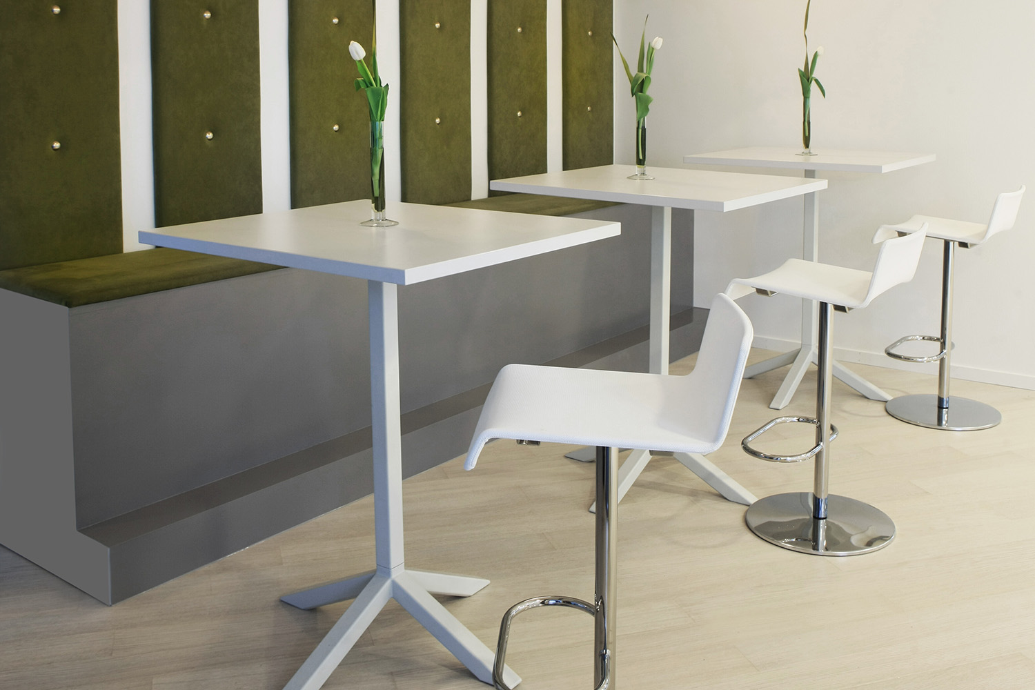 Funk peut également être utilisée comme table haute, adaptée aussi bien aux espaces d'étude que de détente. La table haute est également disponible en deux formats, avec un piètement en T ou un piètement en étoile.