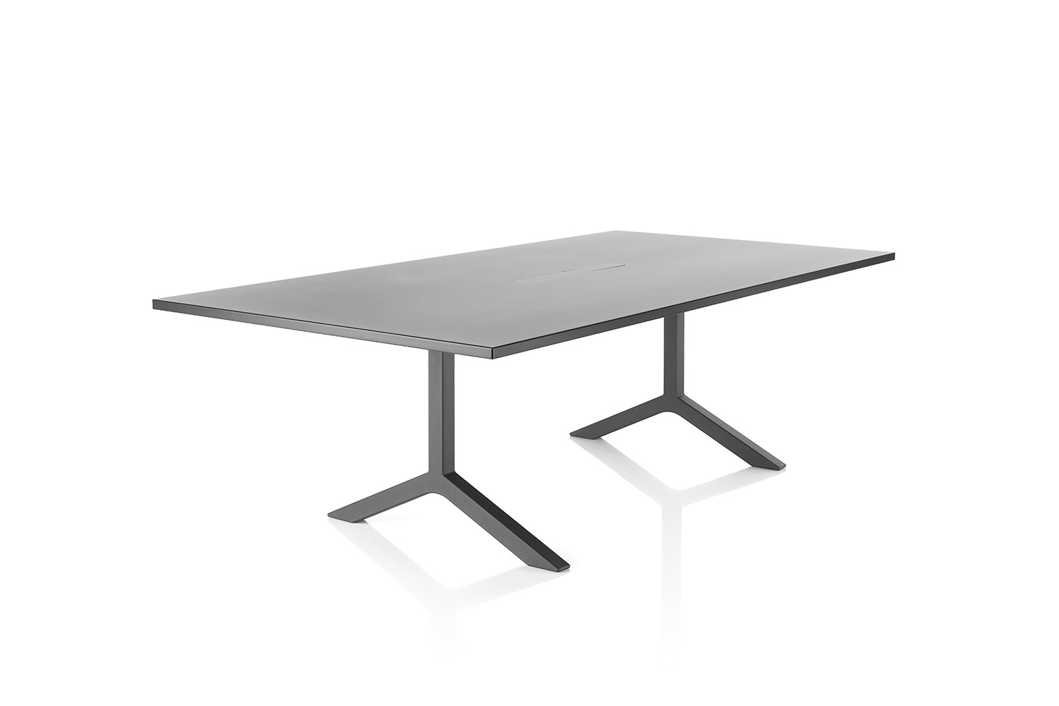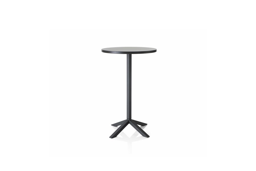 La table est disponible en plusieurs formats et différentes hauteurs, avec un piètement en T ou en étoile à quatre branches. La structure est solidement réalisée en aluminium recyclé moulé, peint par poudrage ou poli.