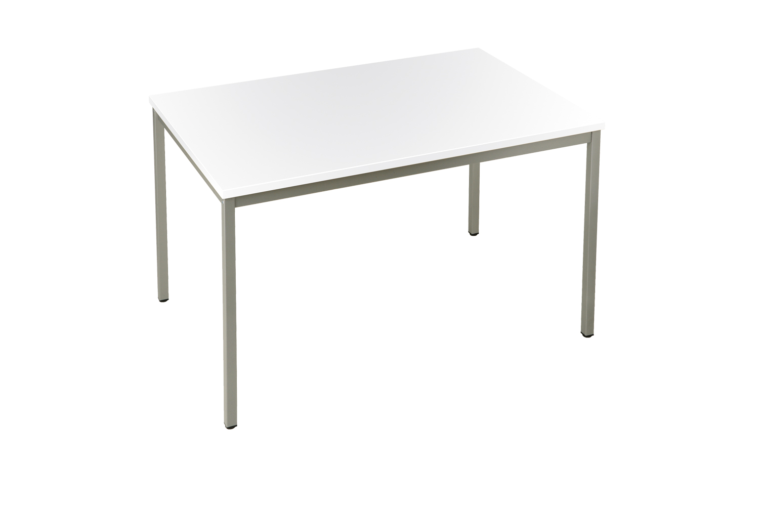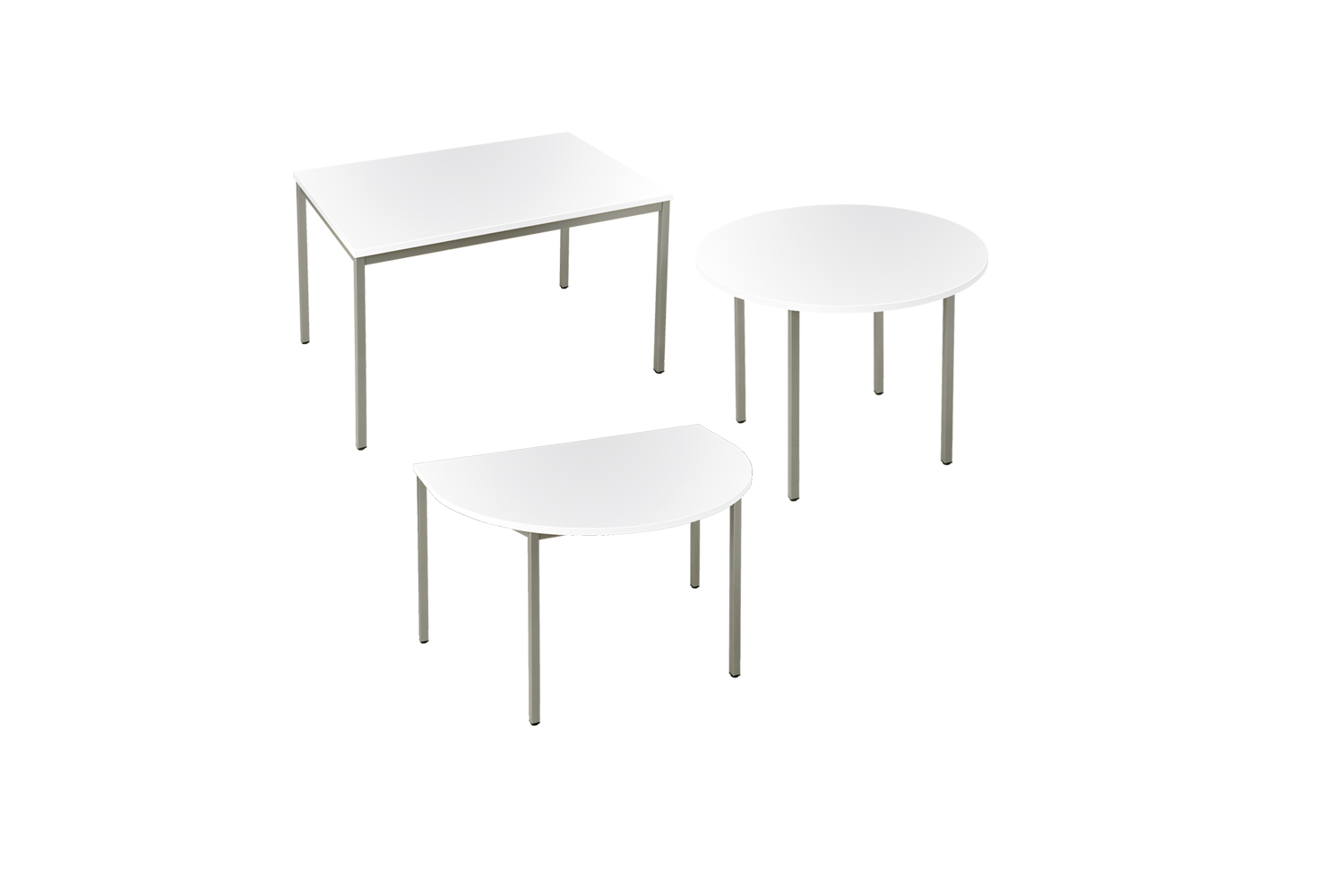 Les tables sont disponibles en trois versions différentes : rectangulaire, ronde et demi-ronde. Le piètement métallique à 4 pieds est disponible en section carrée de 30 x 30 mm.